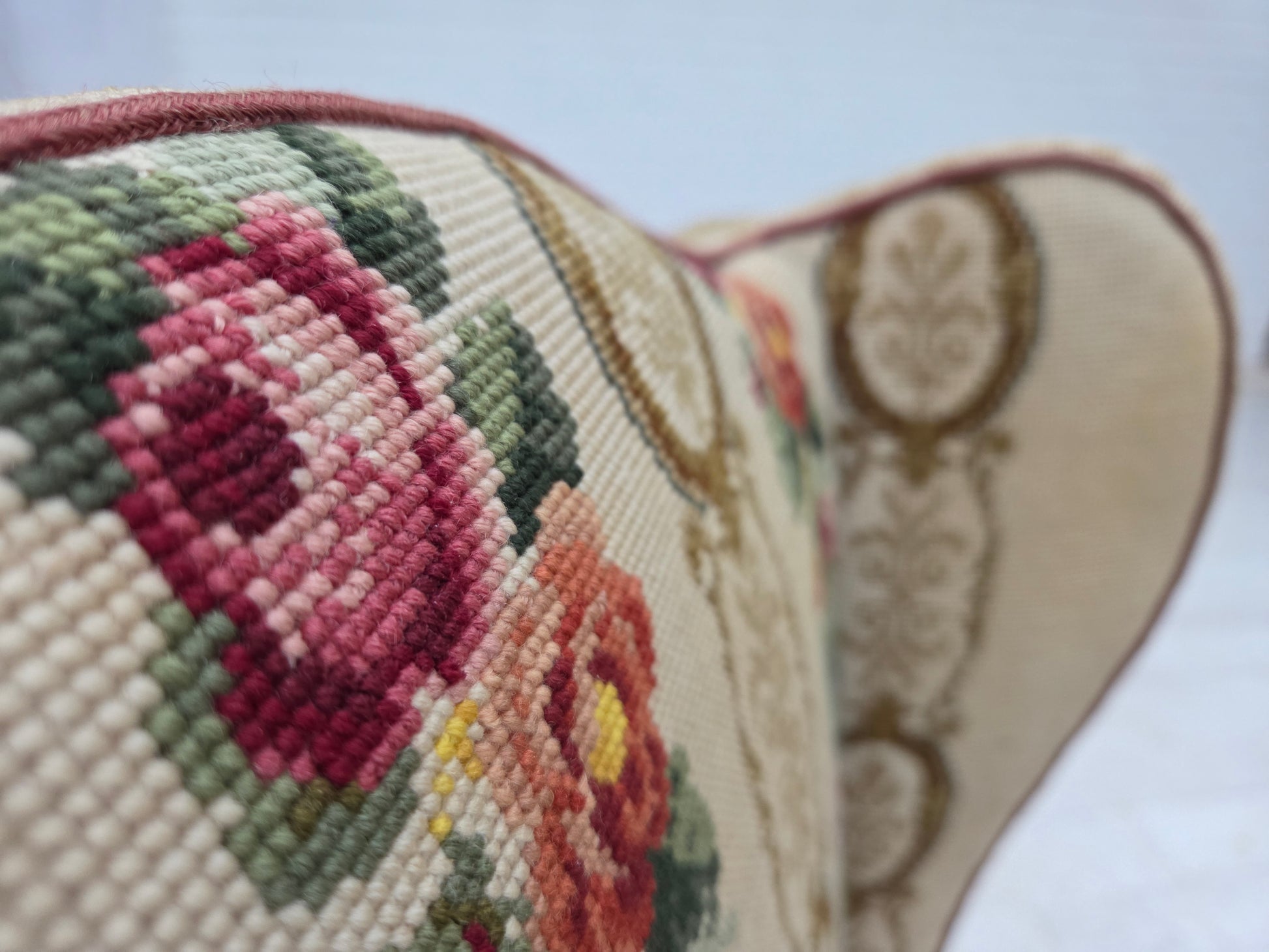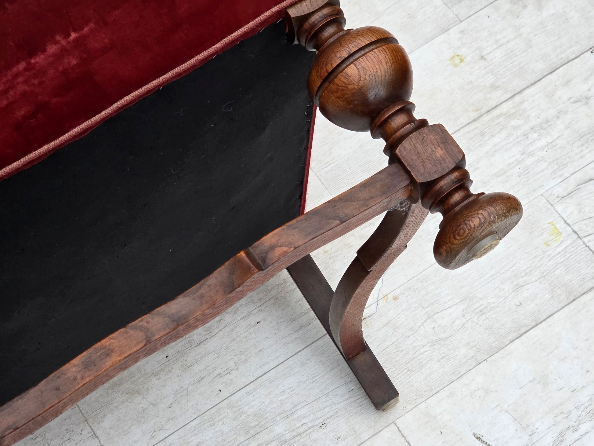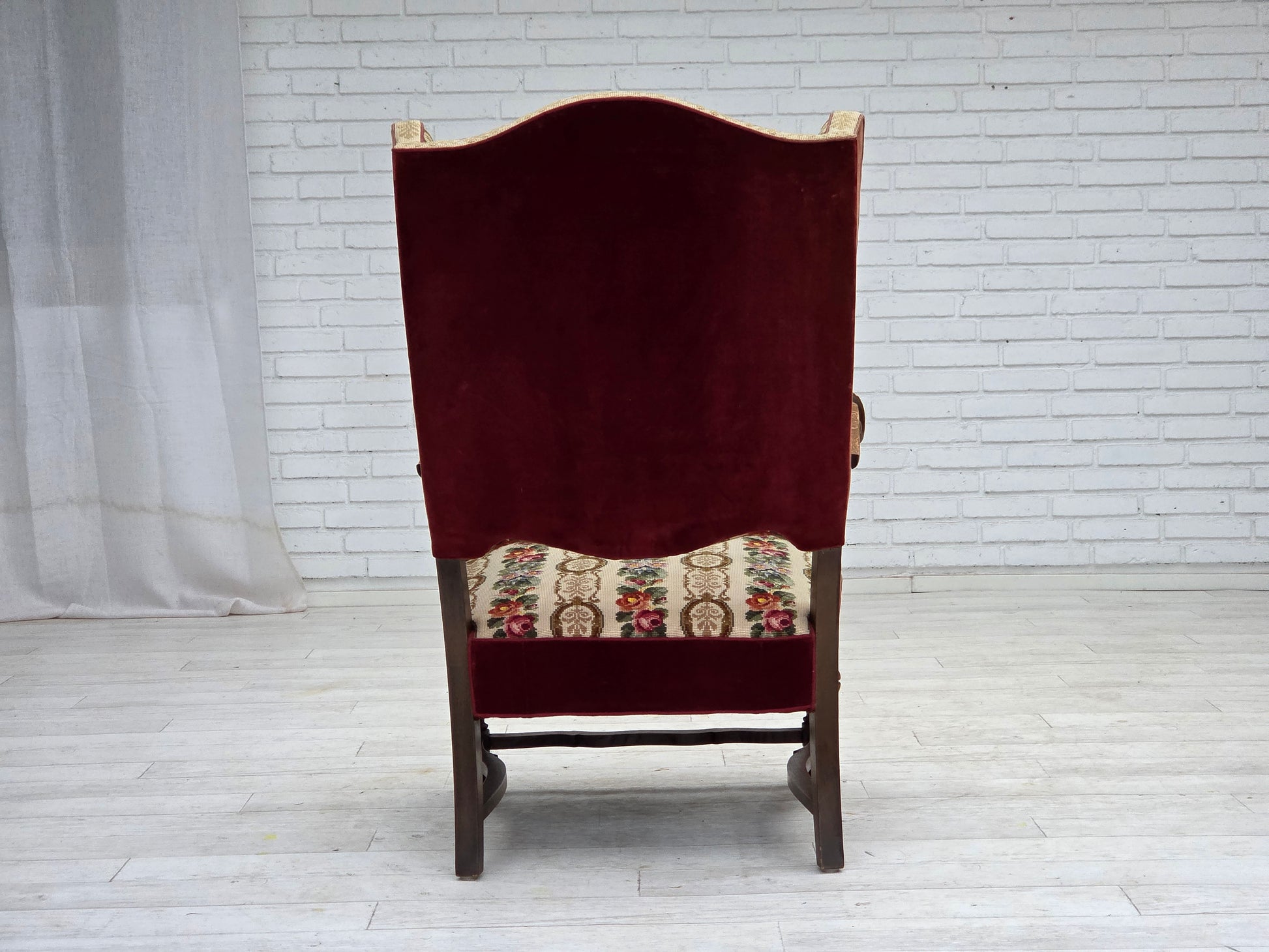 DESCRIPTION: 1950s, Danish wingback armchair. Furniture traditional Danish woven wool fabric, red furniture velour, ash wood legs, springs in the seat. Original good condition: no smells, no stains and stable construction. Manufactured by Danish furniture craftsman in about 1950s. Original Scandinavian vintage design directly from Denmark. The chair was checked by craftsman.