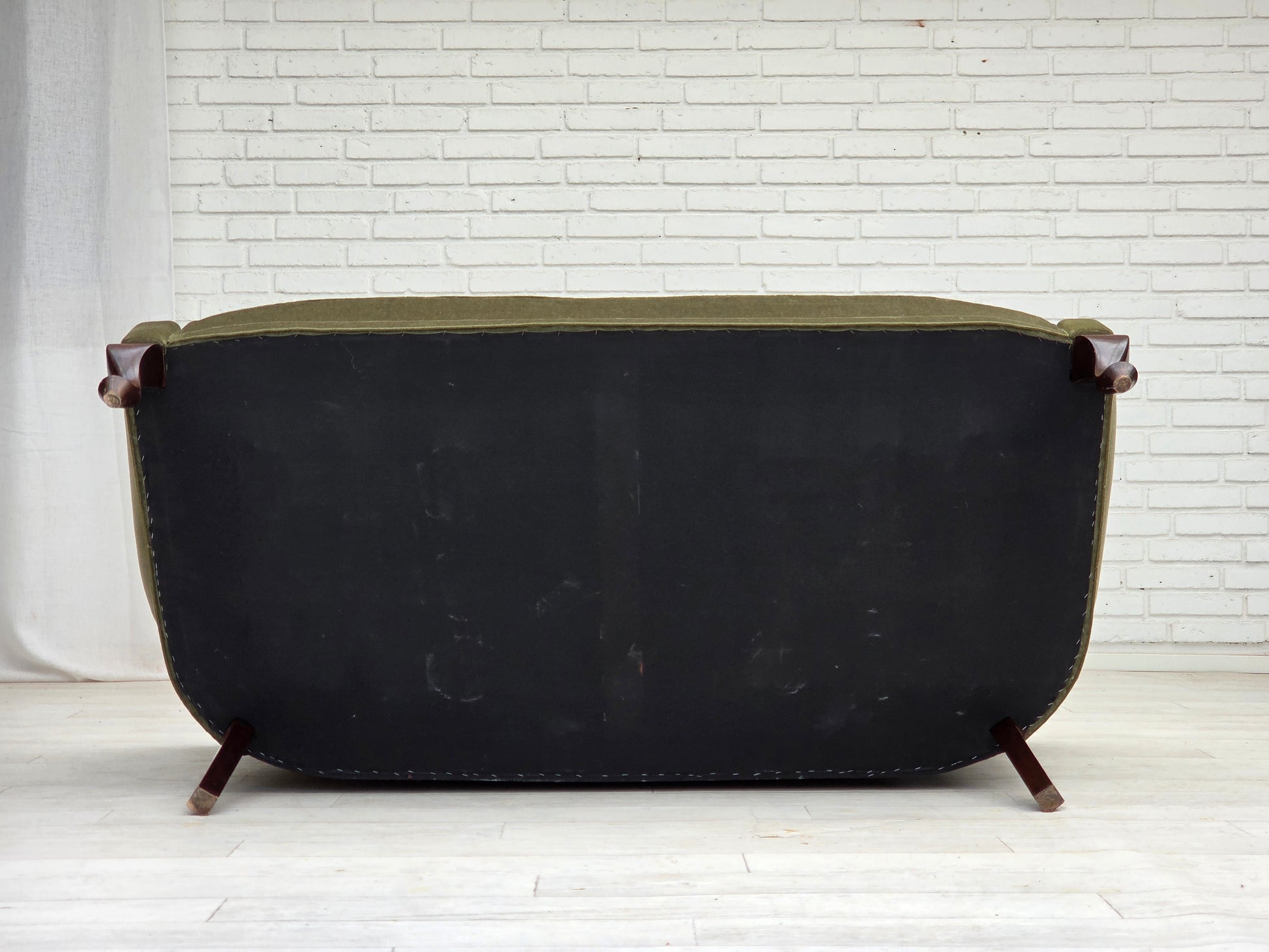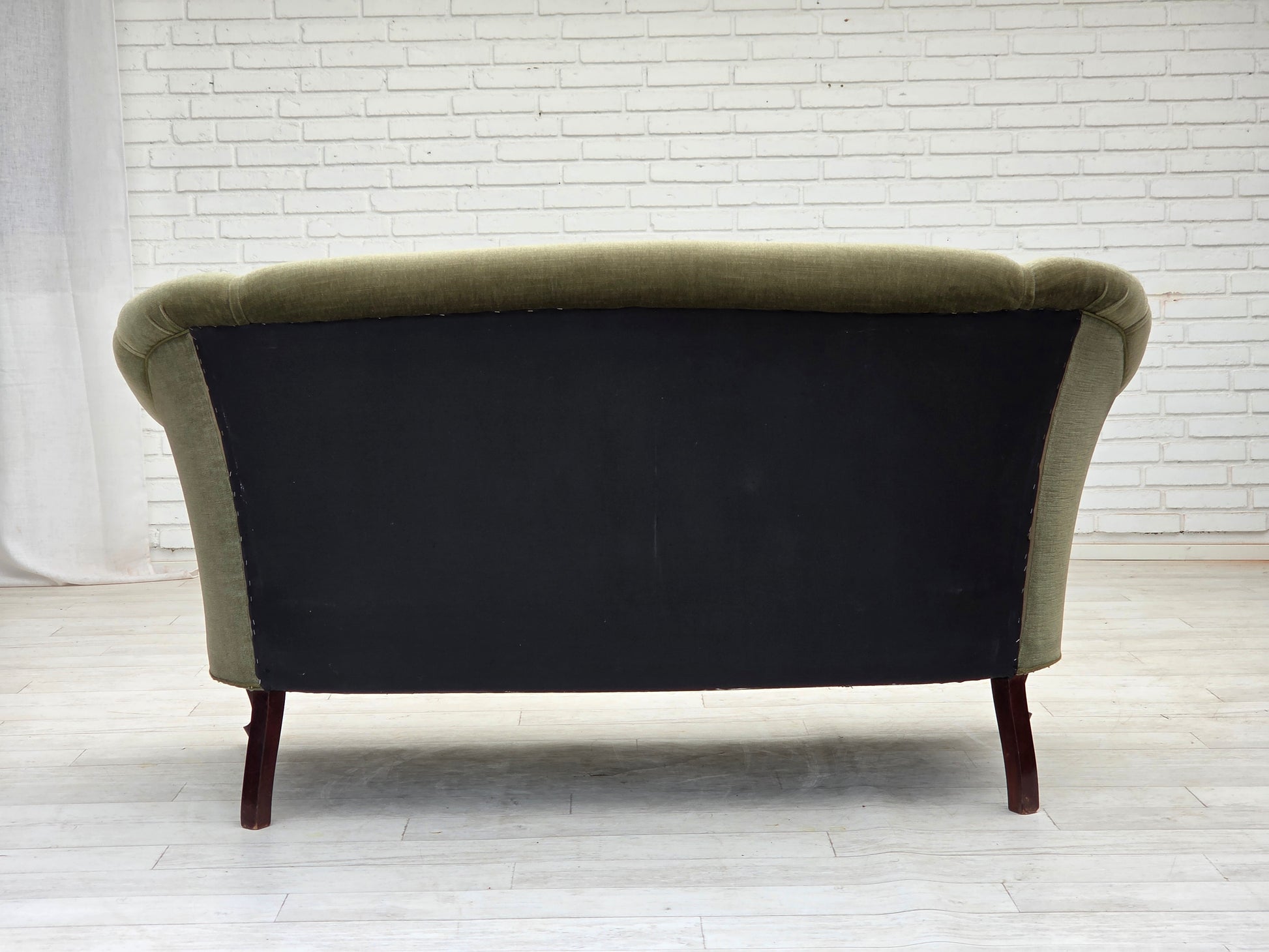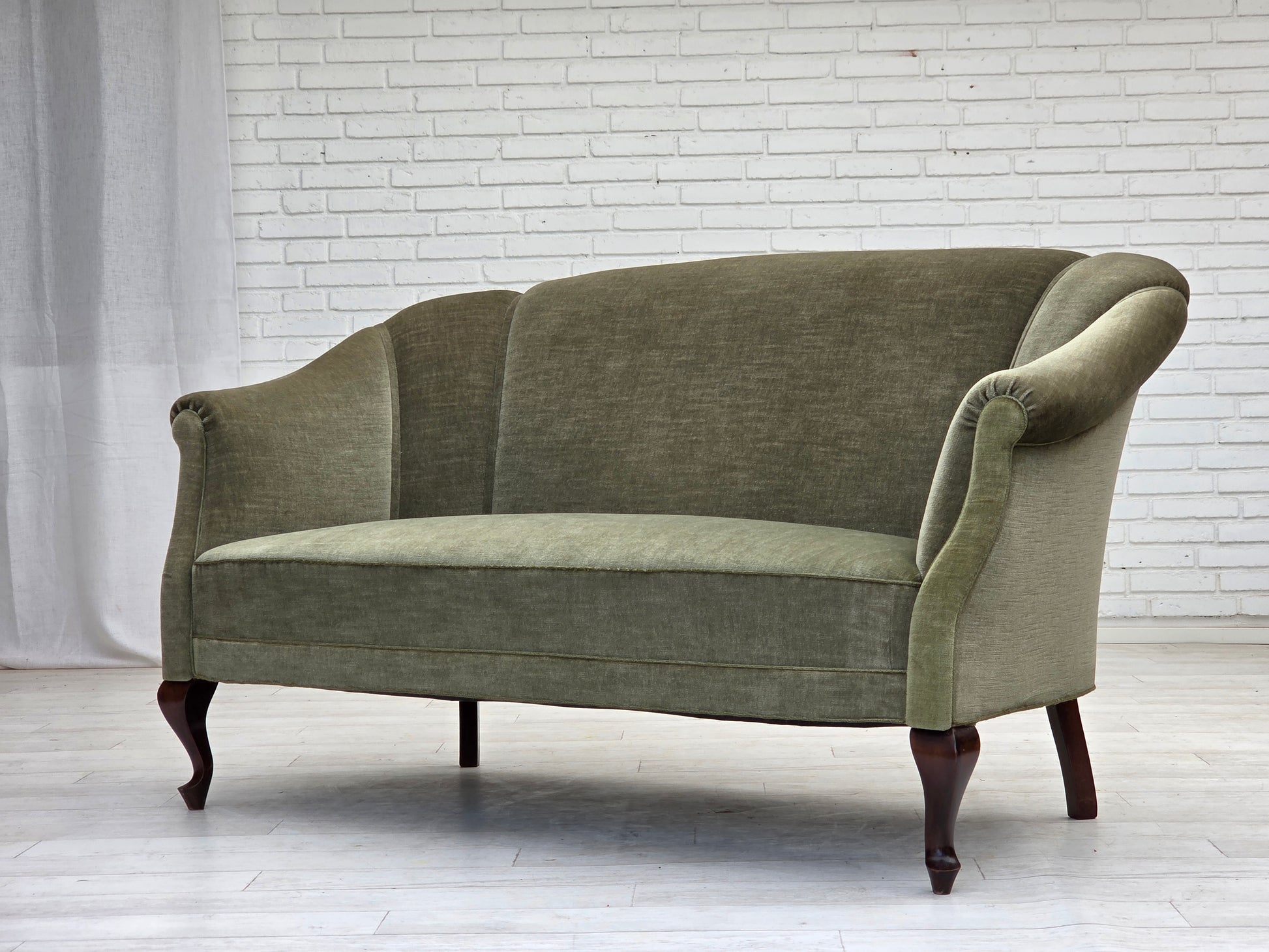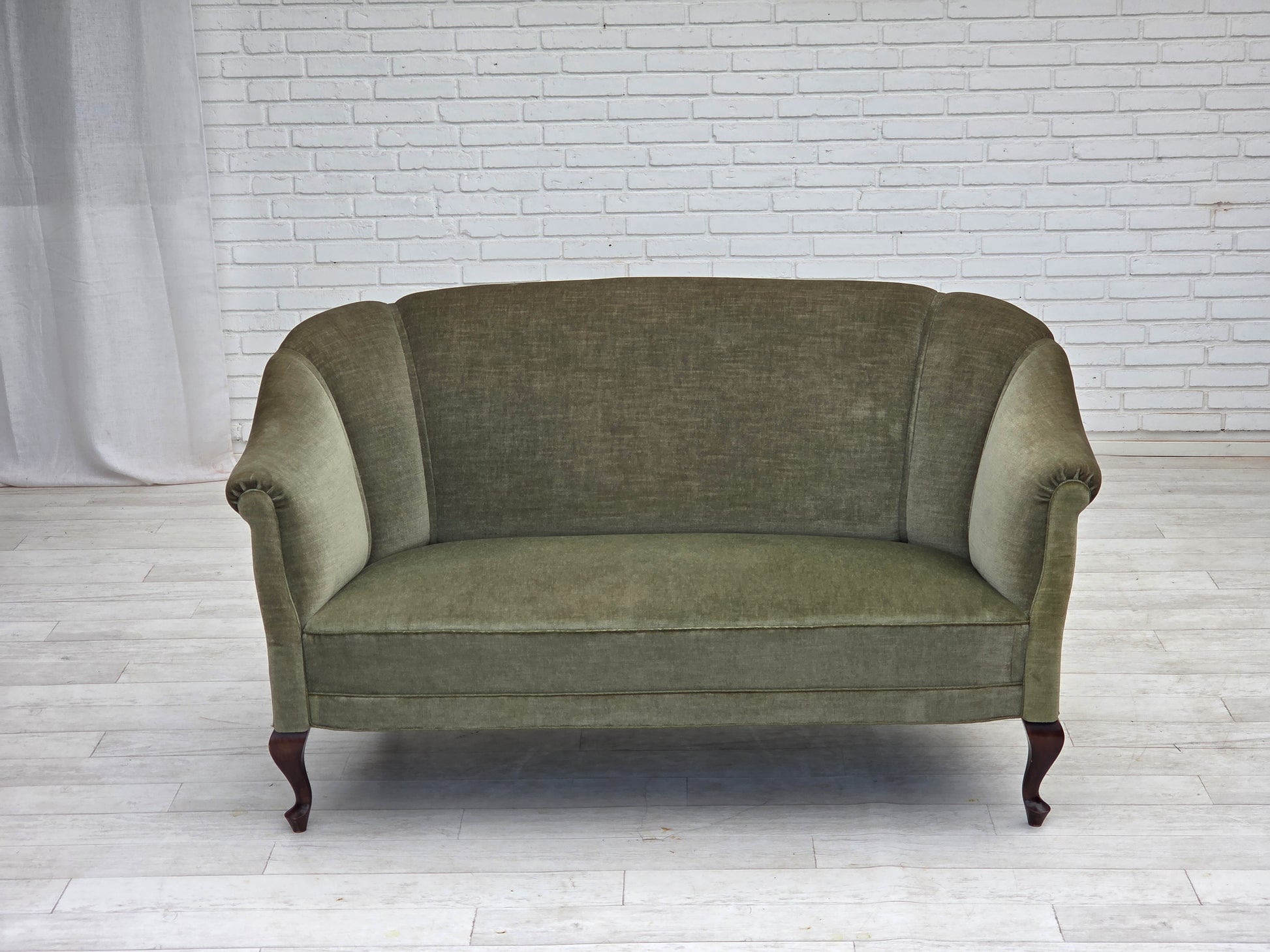 DESCRIPTION: 1960s, Danish 2-seater sofa. Green furniture velour, beech wood legs, brass springs in the seat. Original very good condition: no smells, no stains and stable construction. Manufactured by Danish furniture maker in about 1955-60s. Original Scandinavian craftsmanship vintage design directly from Denmark. The sofa was checked by craftsman.