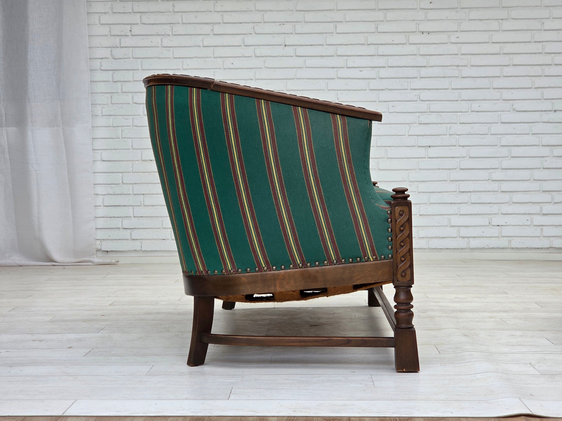 DESCRIPTION: 1950s, Danish 2-seater sofa. Green furniture wool fabric, oak wood, brass springs. Original good condition: no smells, no stains and stable construction. Manufactured by Danish furniture maker in about 1950-55s. Original Scandinavian craftsmanship vintage design directly from Denmark. The sofa was checked by craftsman.