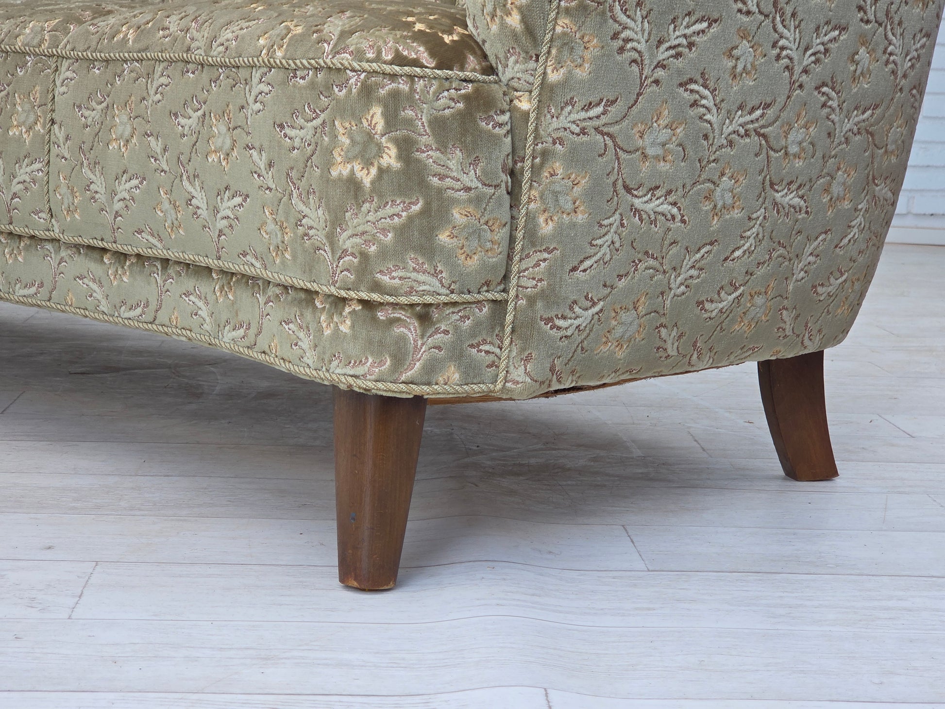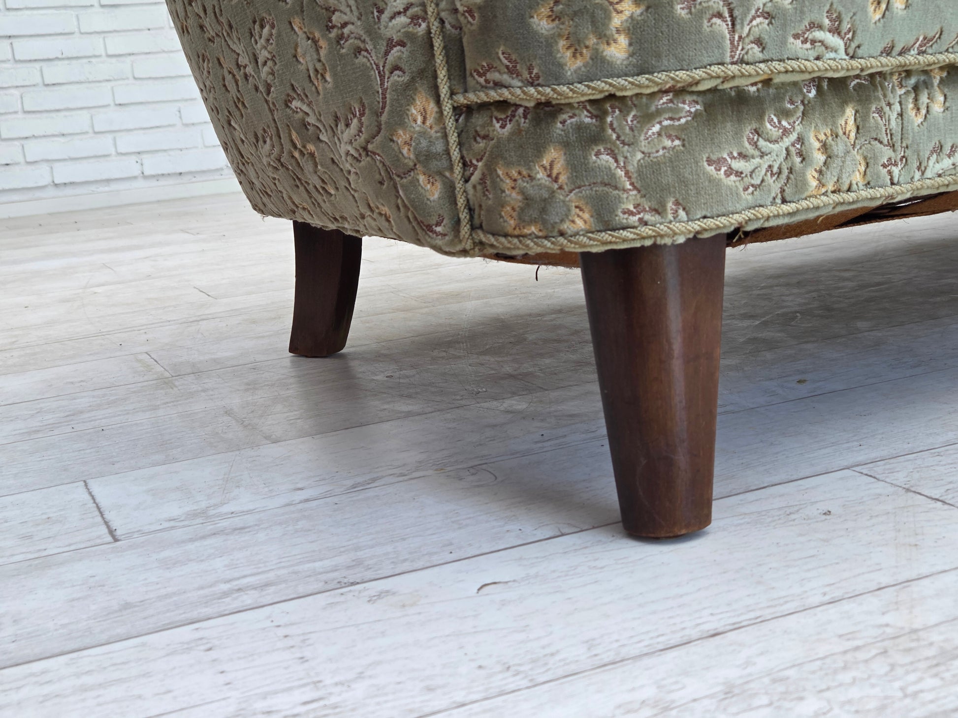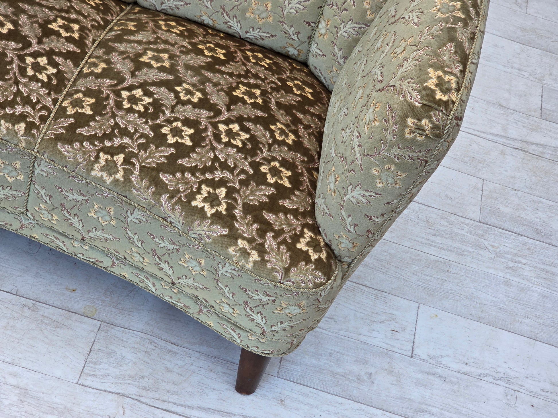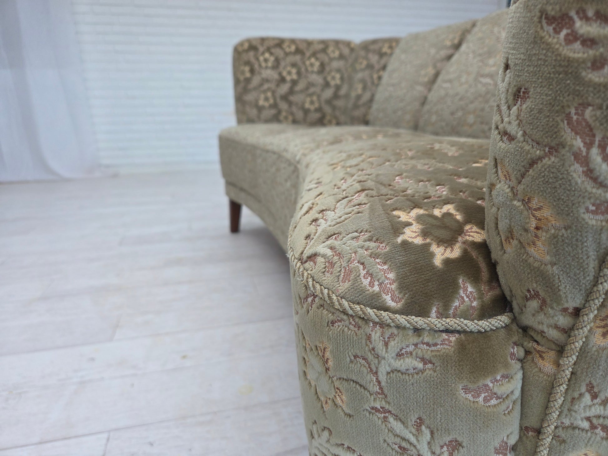 DESCRIPTION: 1960s, Danish 3-seater curved sofa. Green furniture velour, beech wood legs, springs in the seat. Sofa was reupholstered by craftsman about 10-15 years ago. Very good condition: no smells, no stains and stable construction. Manufactured by Danish furniture maker in about 1960-65s. Original Scandinavian vintage design directly from Denmark.
