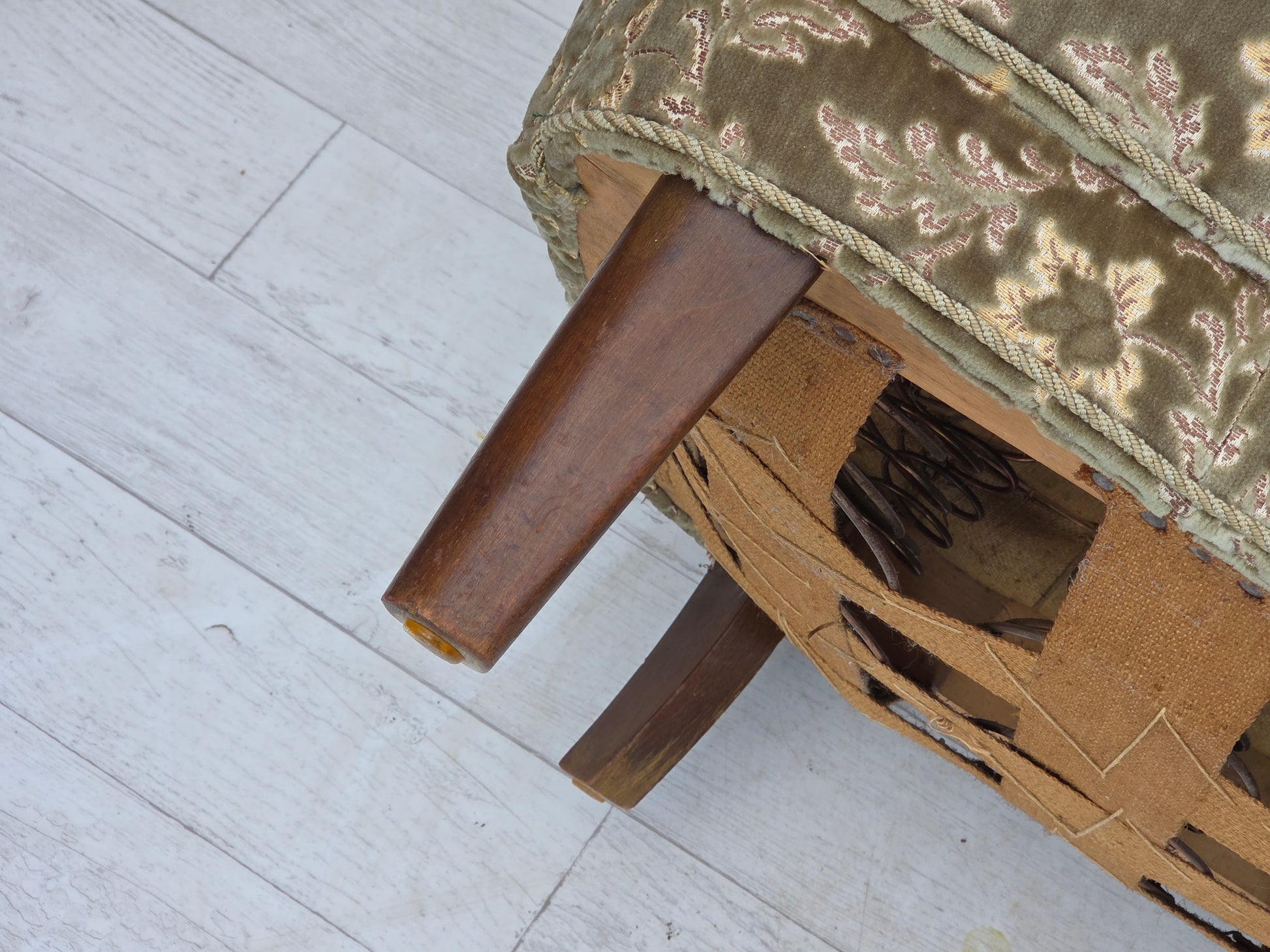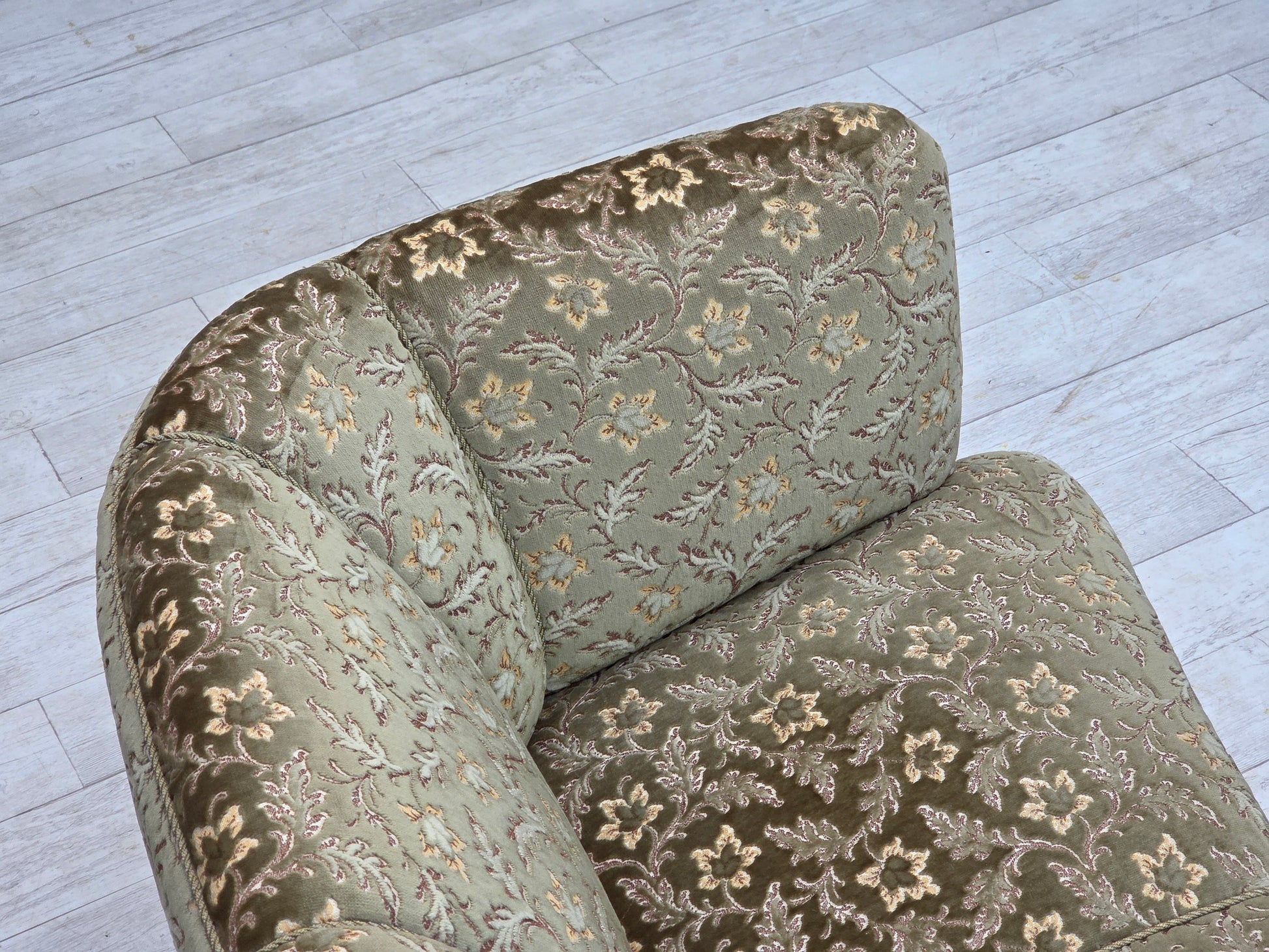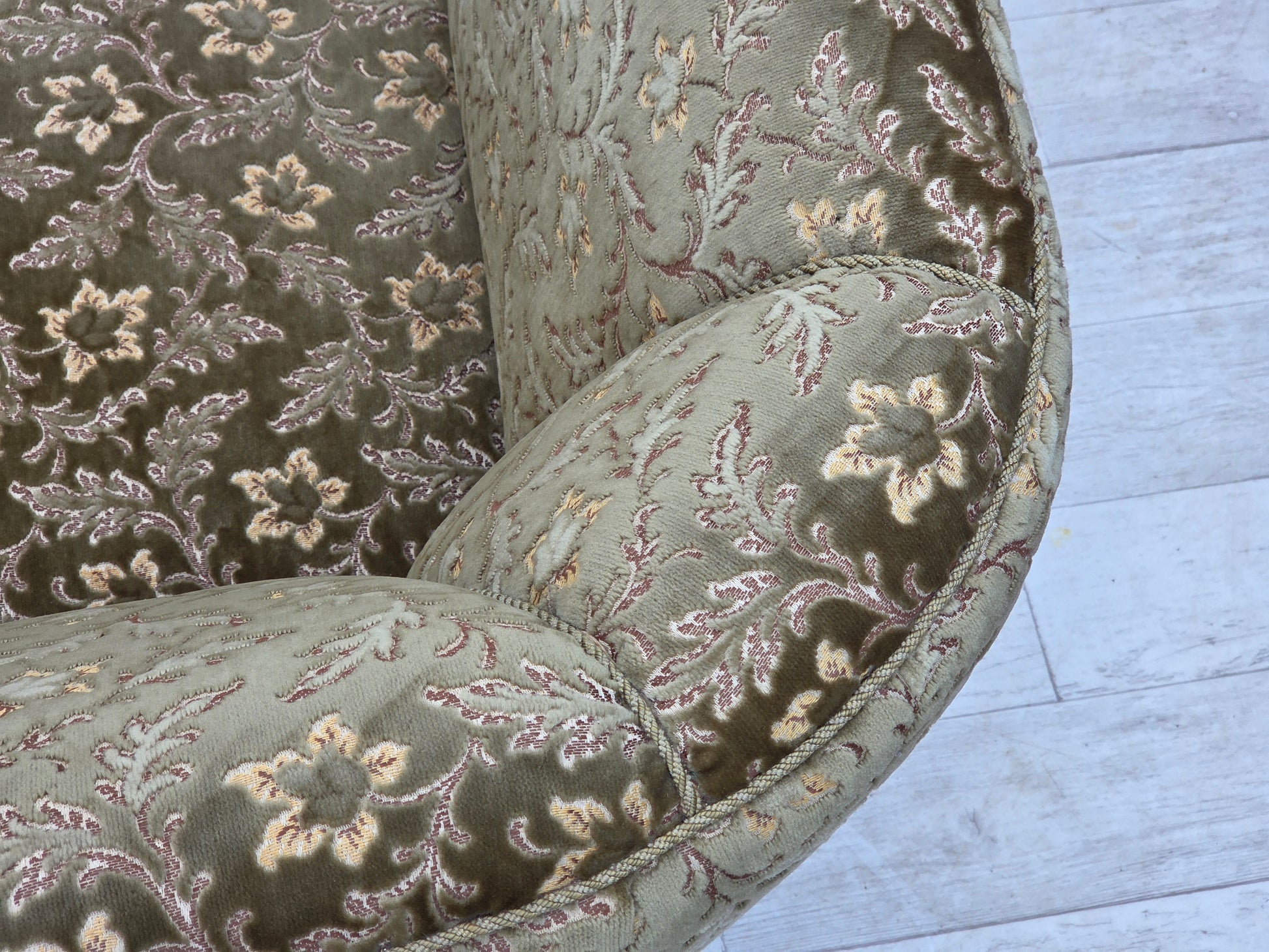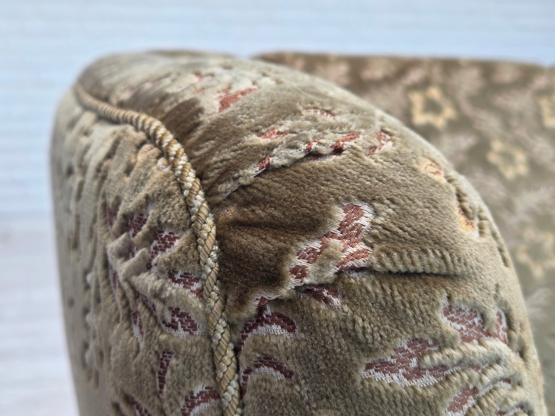 DESCRIPTION: 1960s, Danish 3-seater curved sofa. Green furniture velour, beech wood legs, springs in the seat. Sofa was reupholstered by craftsman about 10-15 years ago. Very good condition: no smells, no stains and stable construction. Manufactured by Danish furniture maker in about 1960-65s. Original Scandinavian vintage design directly from Denmark.