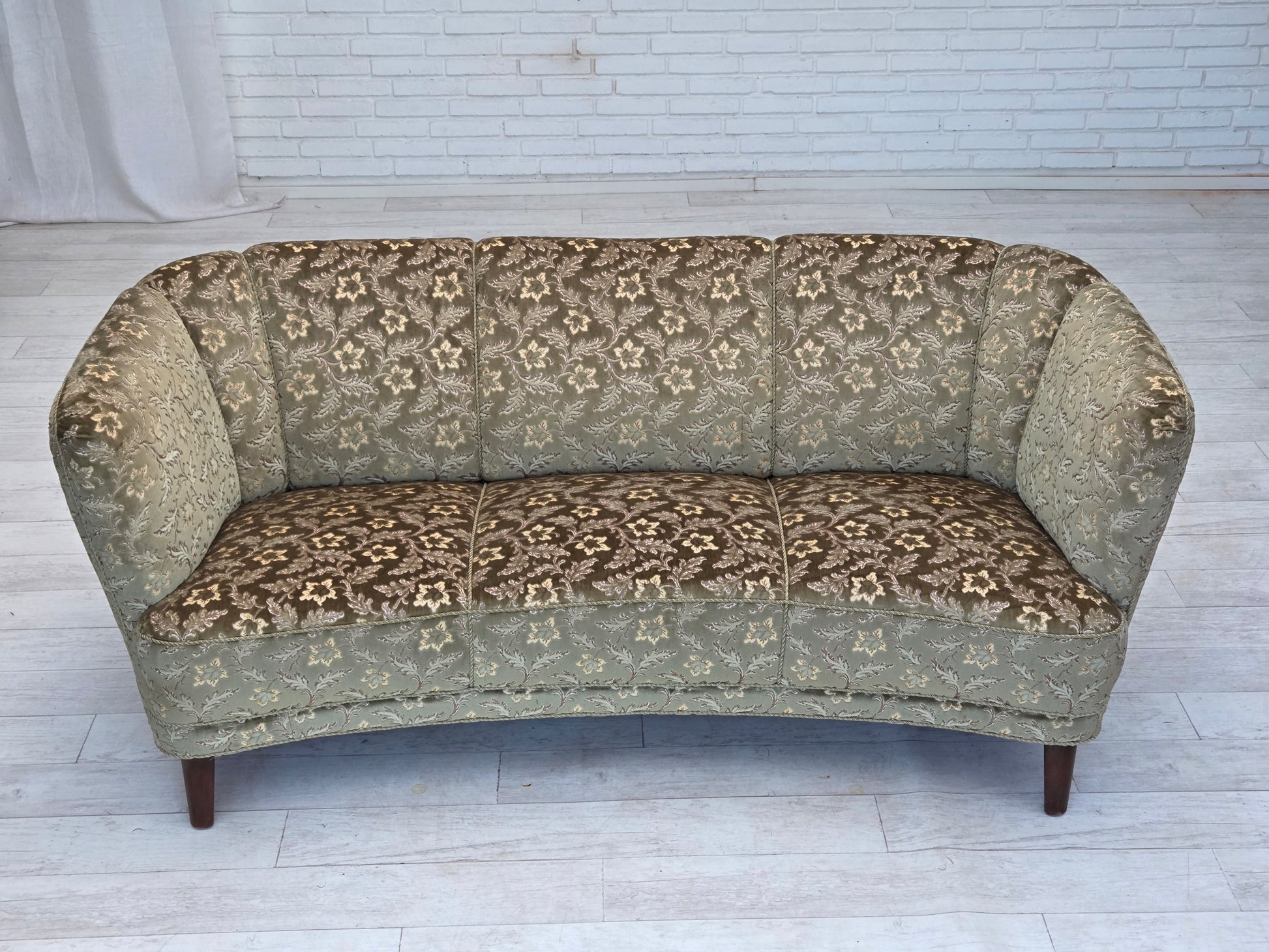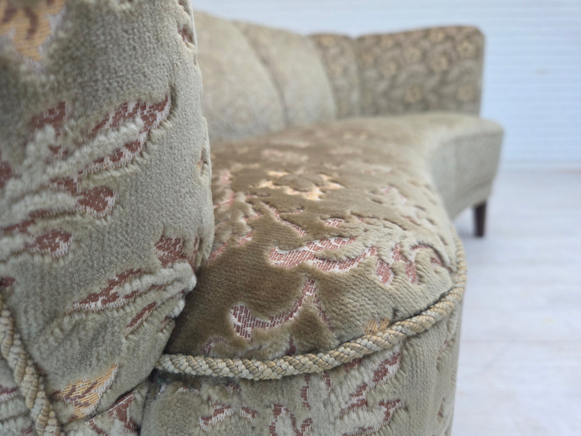 1960s, Danish 3-seater curved sofa, green furniture velour, beech wood legs.