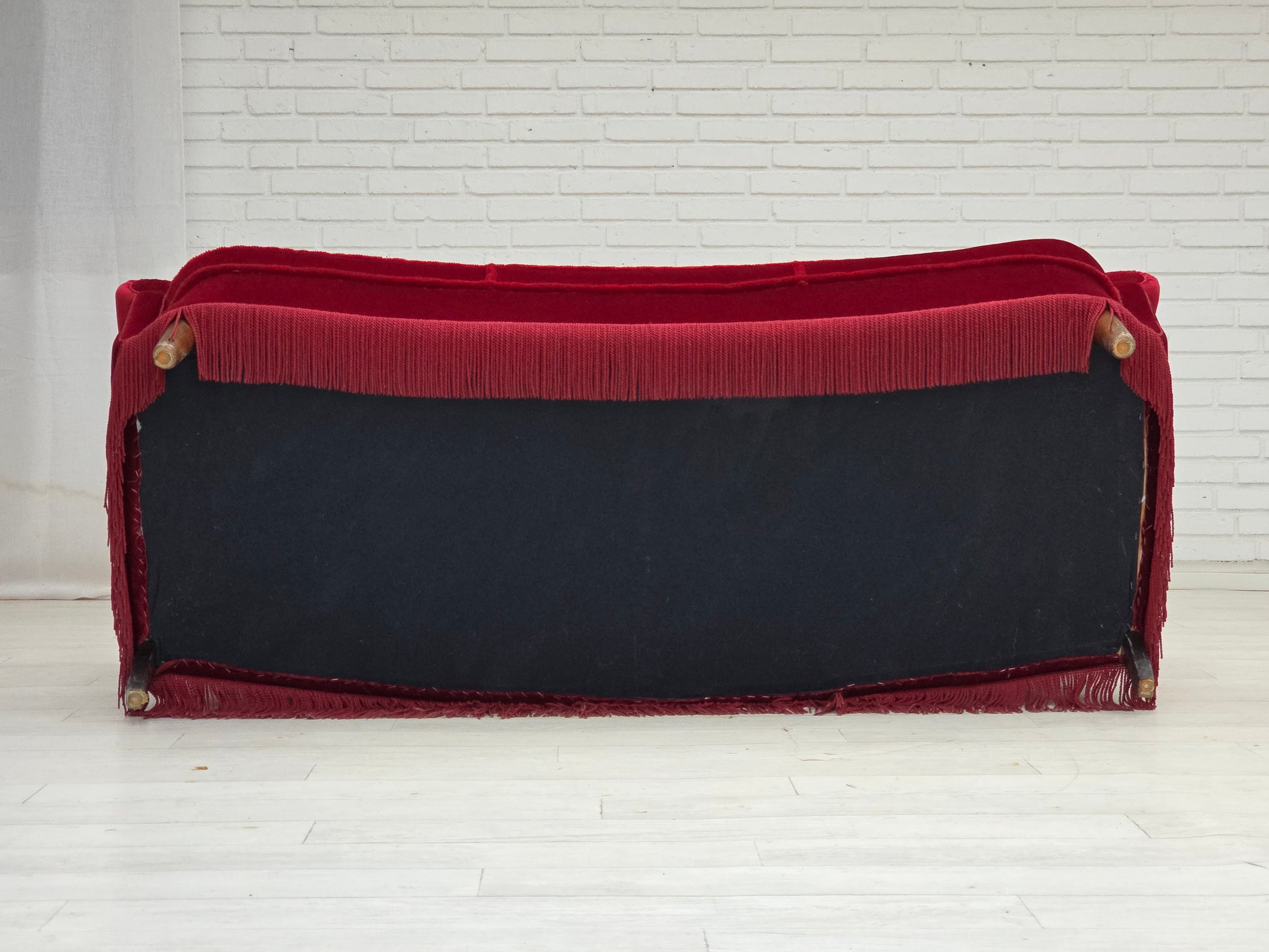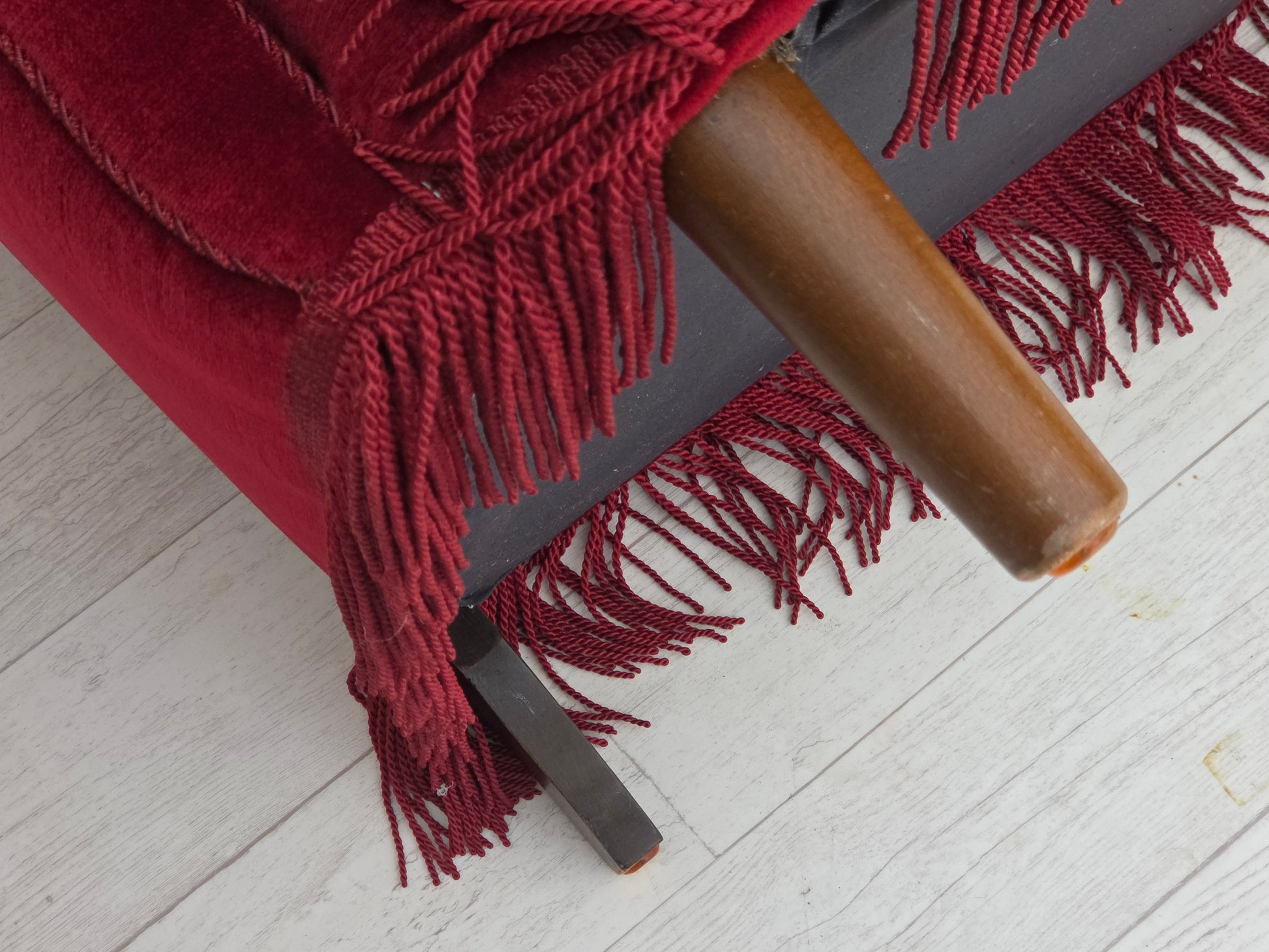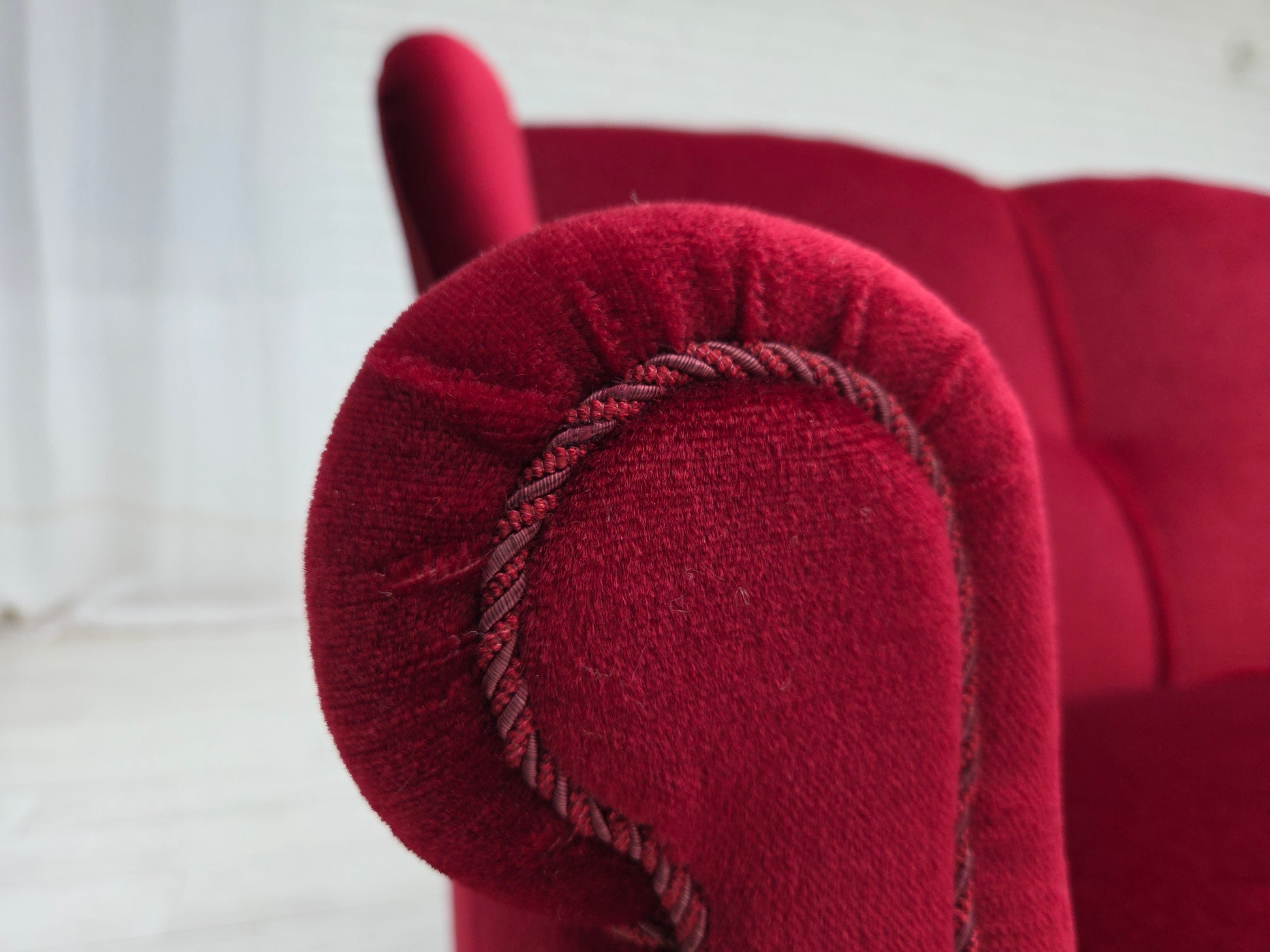 DESCRIPTION: 1960s, Danish 3-seater curved sofa. Red furniture velour, beech wood legs, springs in the seat. Sofa was reupholstered by craftsman about 15 years ago. Manufactured by Danish furniture maker in about 1960-65s. Very good condition: no smells, no stains and stable construction. Original Scandinavian vintage design directly from Denmark. The sofa was checked by craftsman.