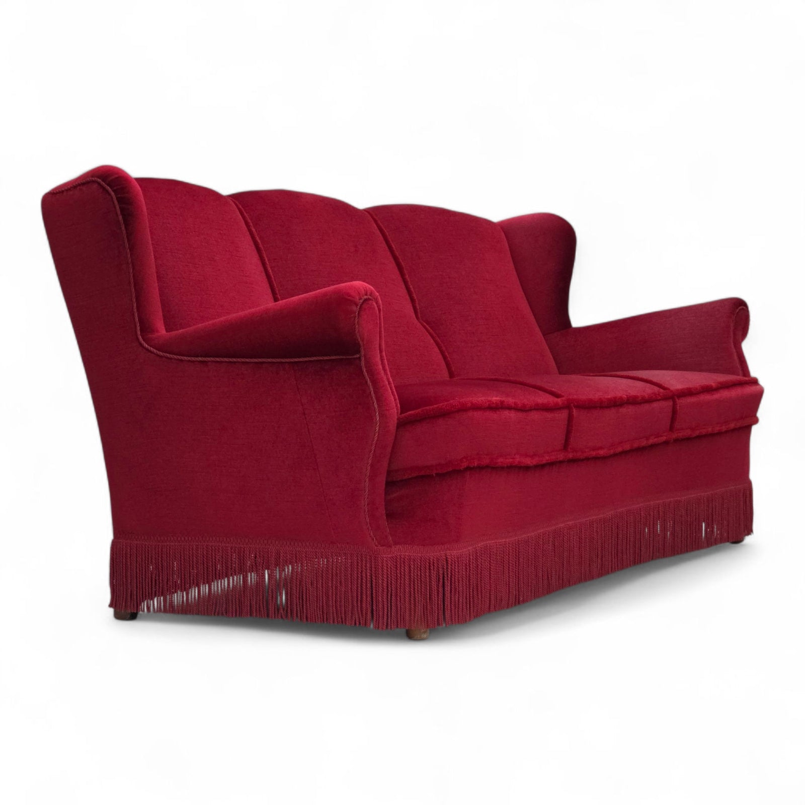 1960s, Danish 3-seater curved sofa, red furniture velour.