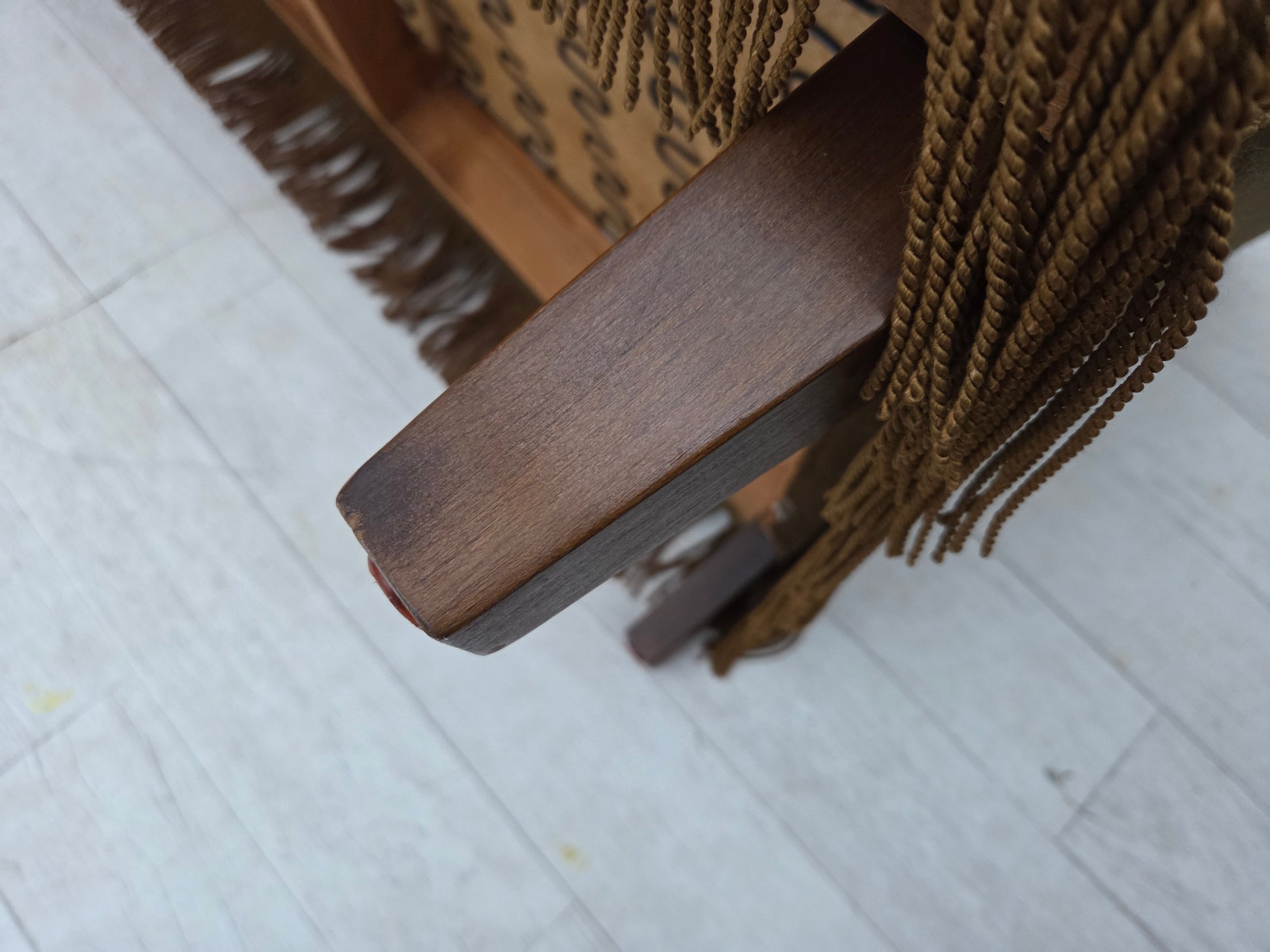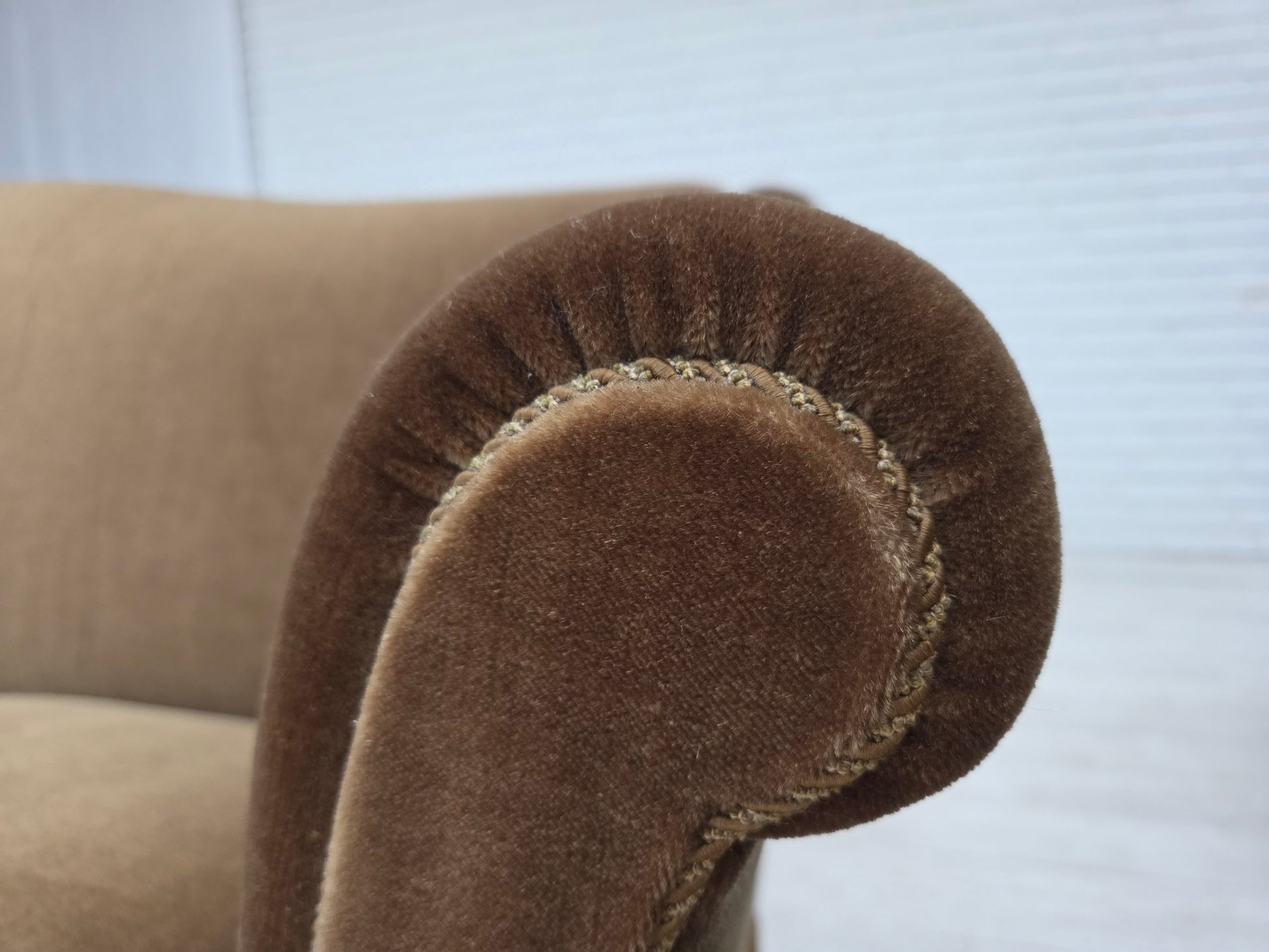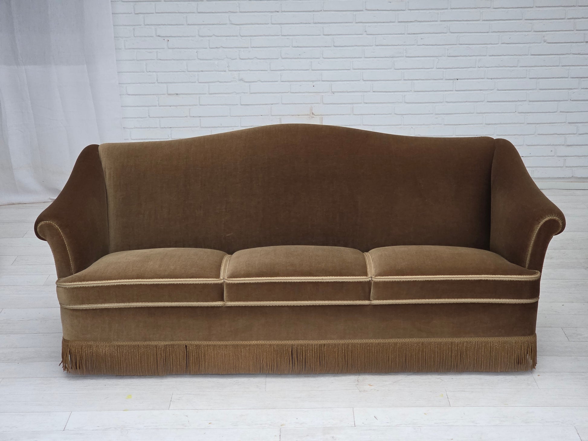 DESCRIPTION: 1960s, Danish 3-seater sofa. Olive green furniture velour, beech wood legs, springs in the seat. Original very good condition: no smells, no stains and stable construction. Manufactured by Danish furniture maker in about 1965-70s. Original Scandinavian vintage design directly from Denmark. The sofa was checked by craftsman.