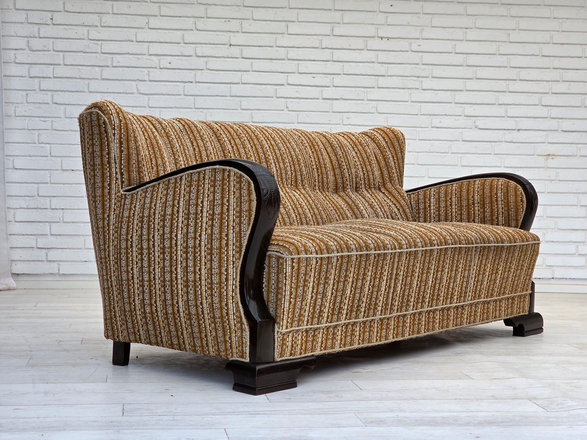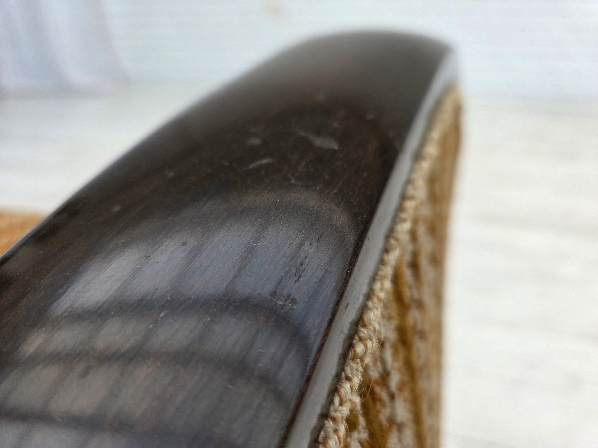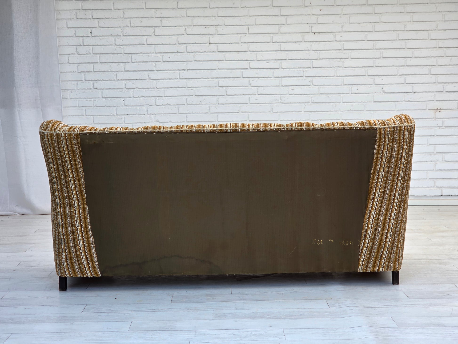 DESCRIPTION: 1960s, Danish 3-seater sofa. Original brown furniture wool in stripes. Original very good condition: no smells, no stains and stable construction. Brass springs in the seat, dark beech wood. Manufactured by Danish furniture maker in about 1960-65s. Original Scandinavian vintage design directly from Denmark. The sofa was checked by craftsman.