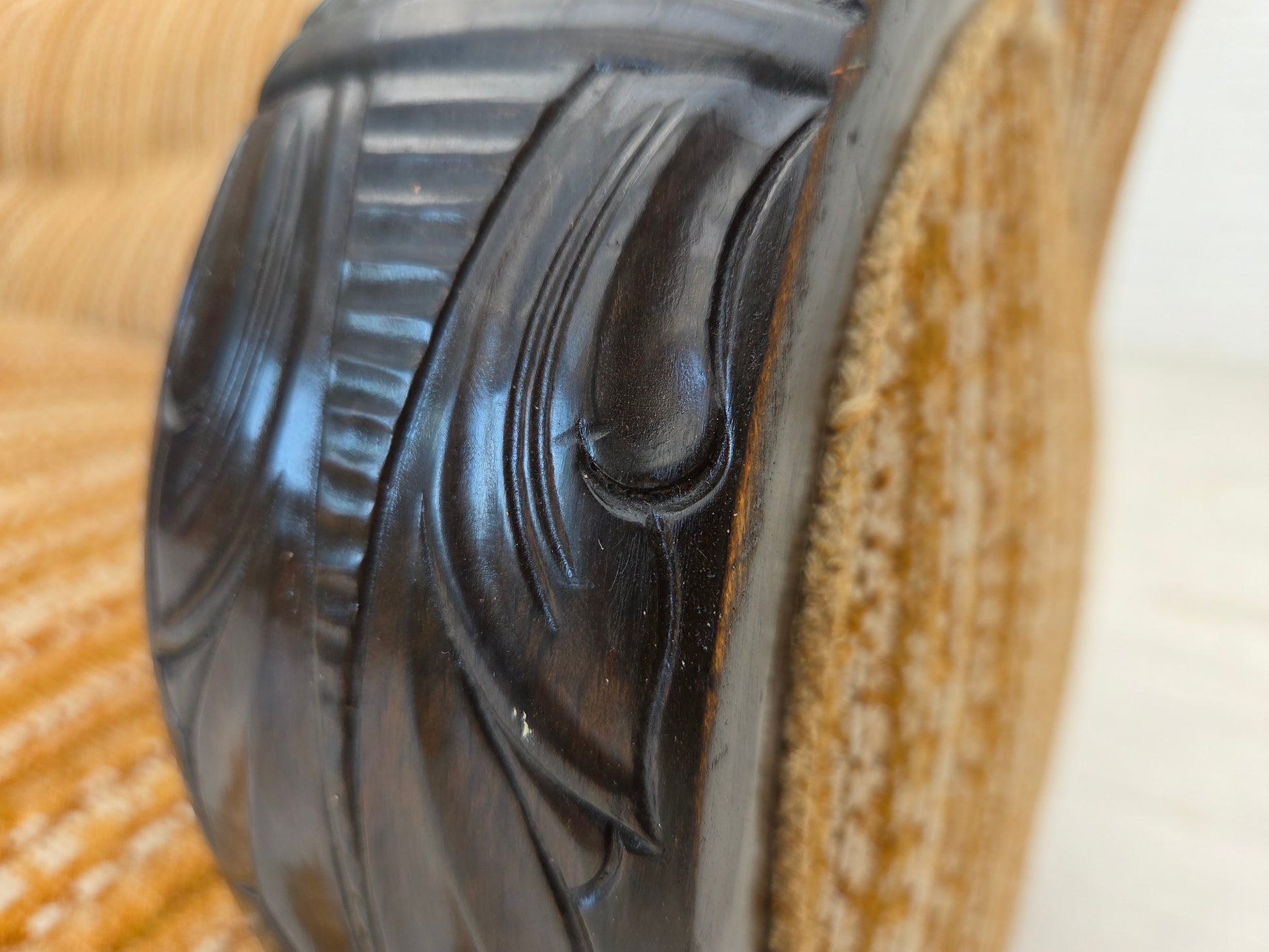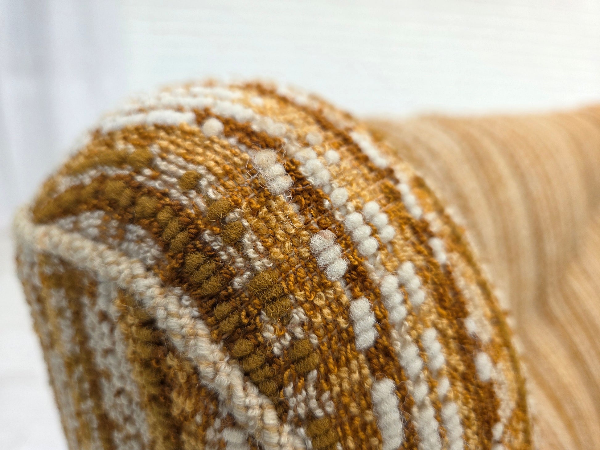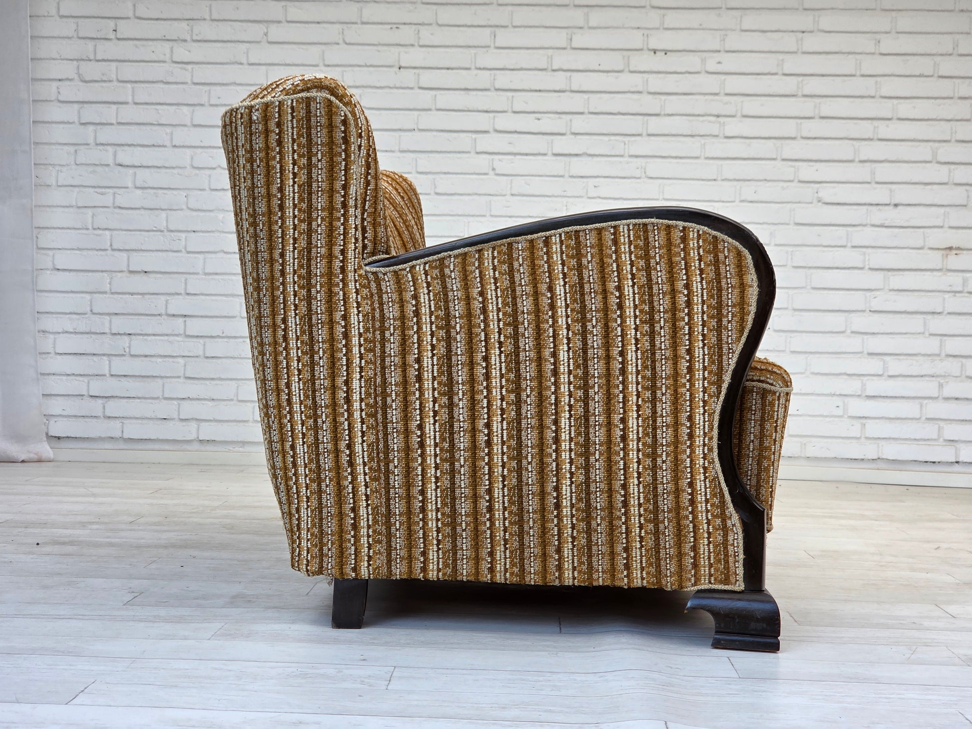 DESCRIPTION: 1960s, Danish 3-seater sofa. Original brown furniture wool in stripes. Original very good condition: no smells, no stains and stable construction. Brass springs in the seat, dark beech wood. Manufactured by Danish furniture maker in about 1960-65s. Original Scandinavian vintage design directly from Denmark. The sofa was checked by craftsman.
