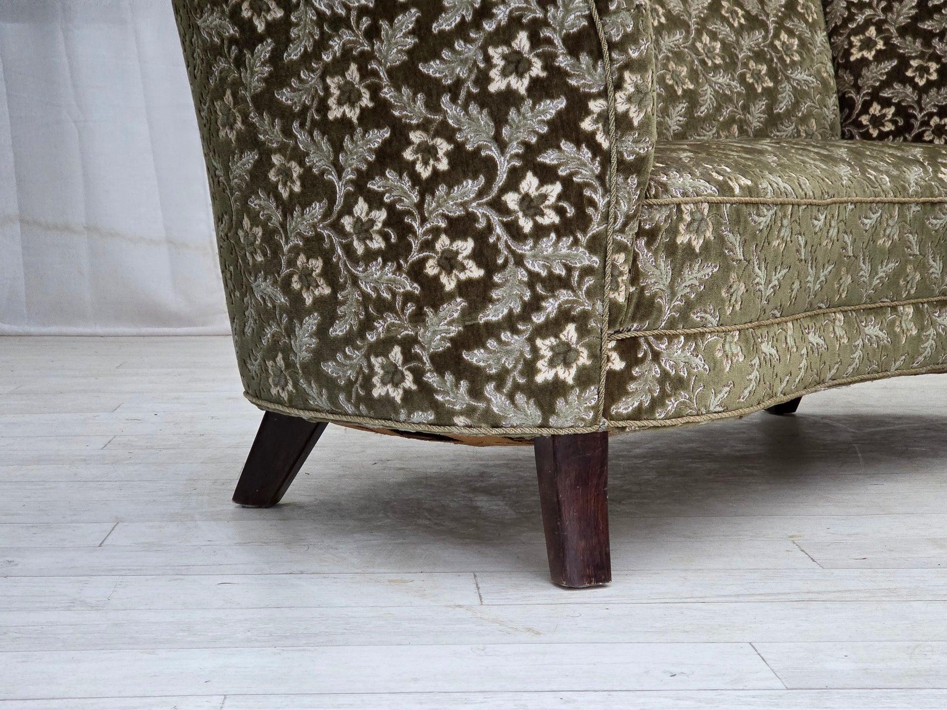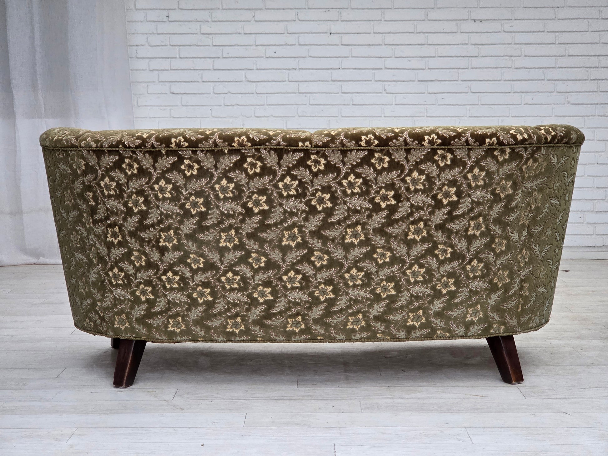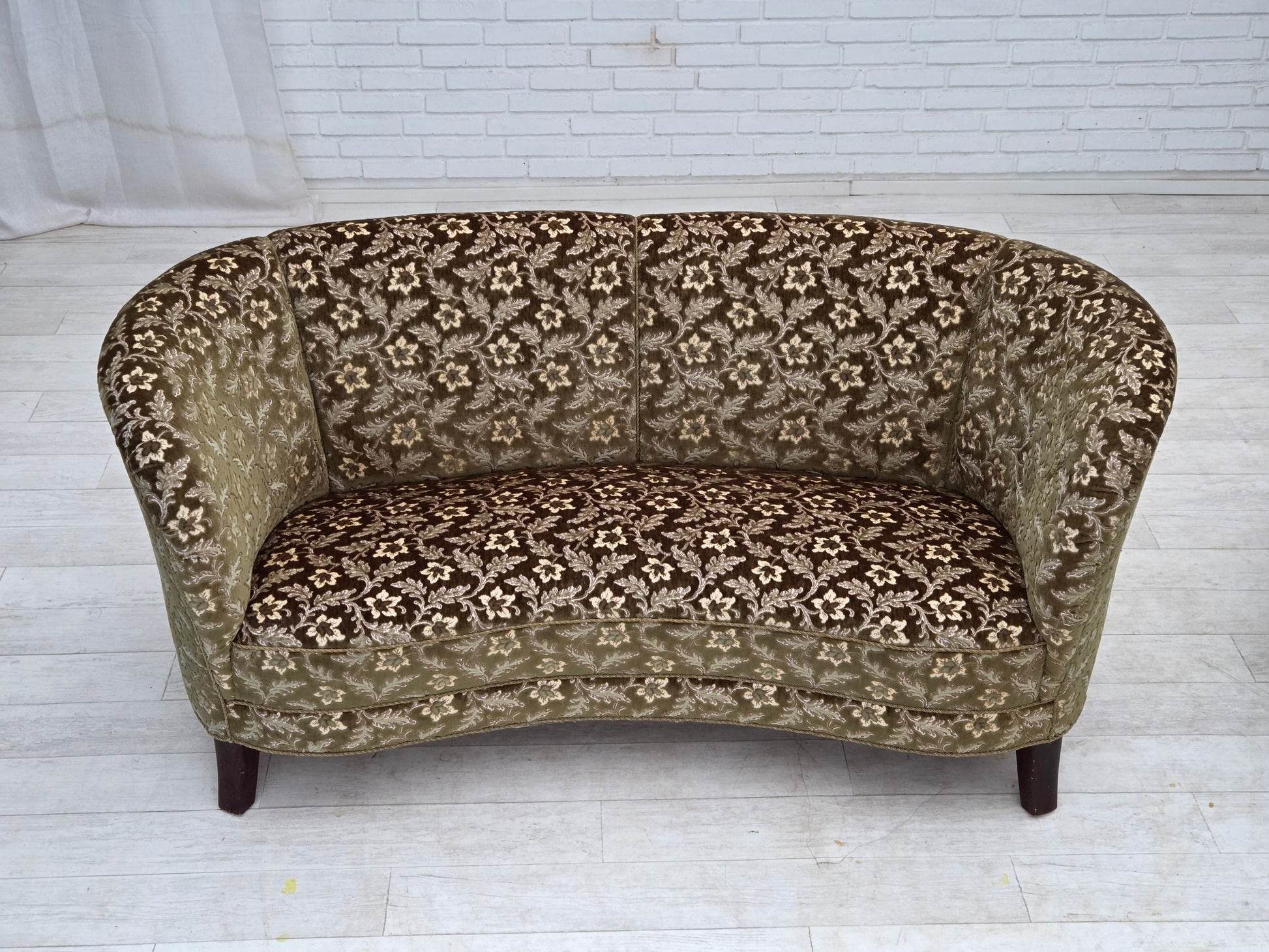 DESCRIPTION: 1960s, Danish curved 2-seater sofa. Green furniture velour, beech wood legs, brass springs in the seat. Sofa was reupholstered about 10 years ago by craftsman. Very good condition: no smells, no stains and stable construction. Manufactured by Danish furniture maker in about 1960-65s. Original Scandinavian vintage design directly from Denmark.