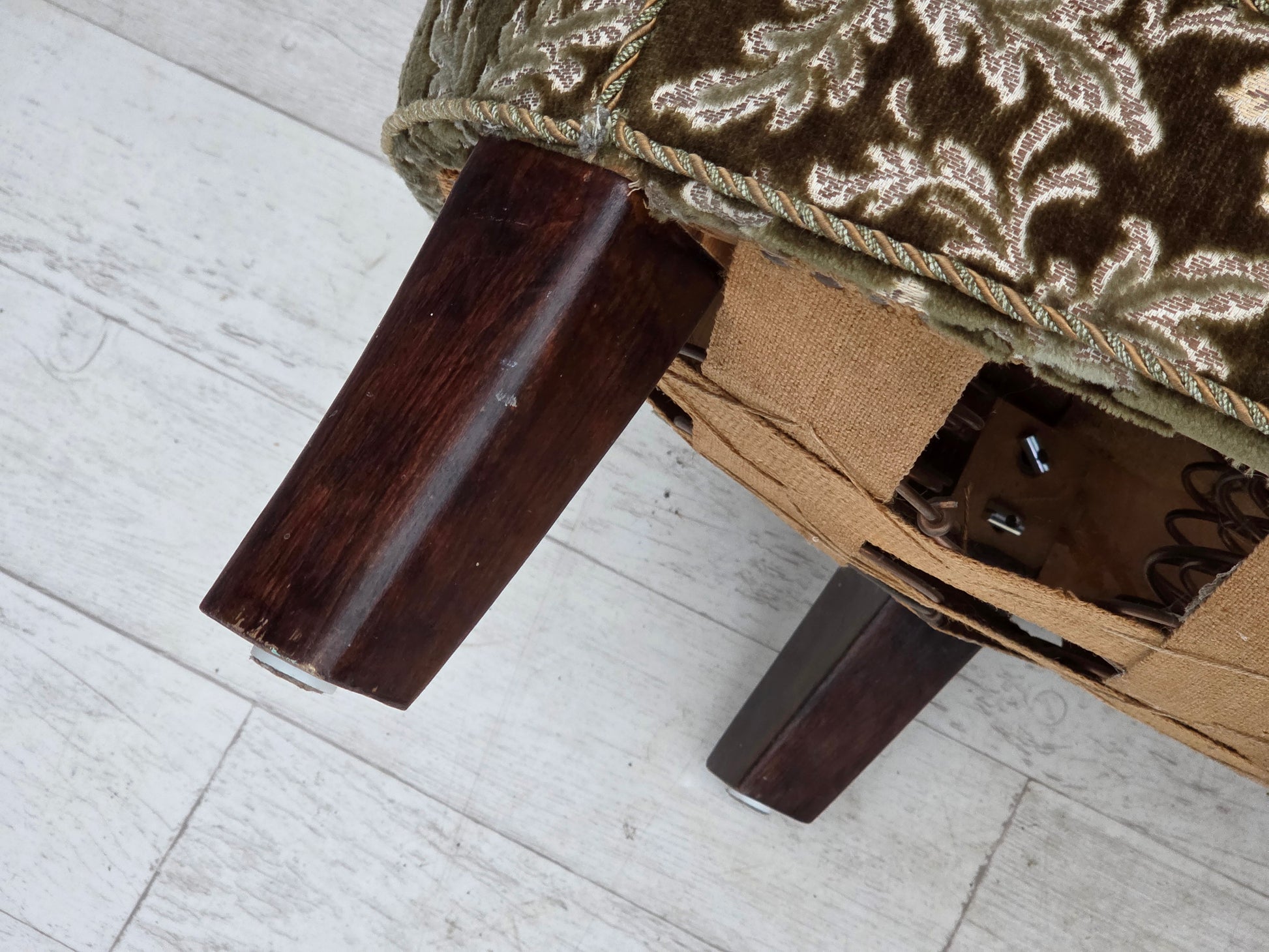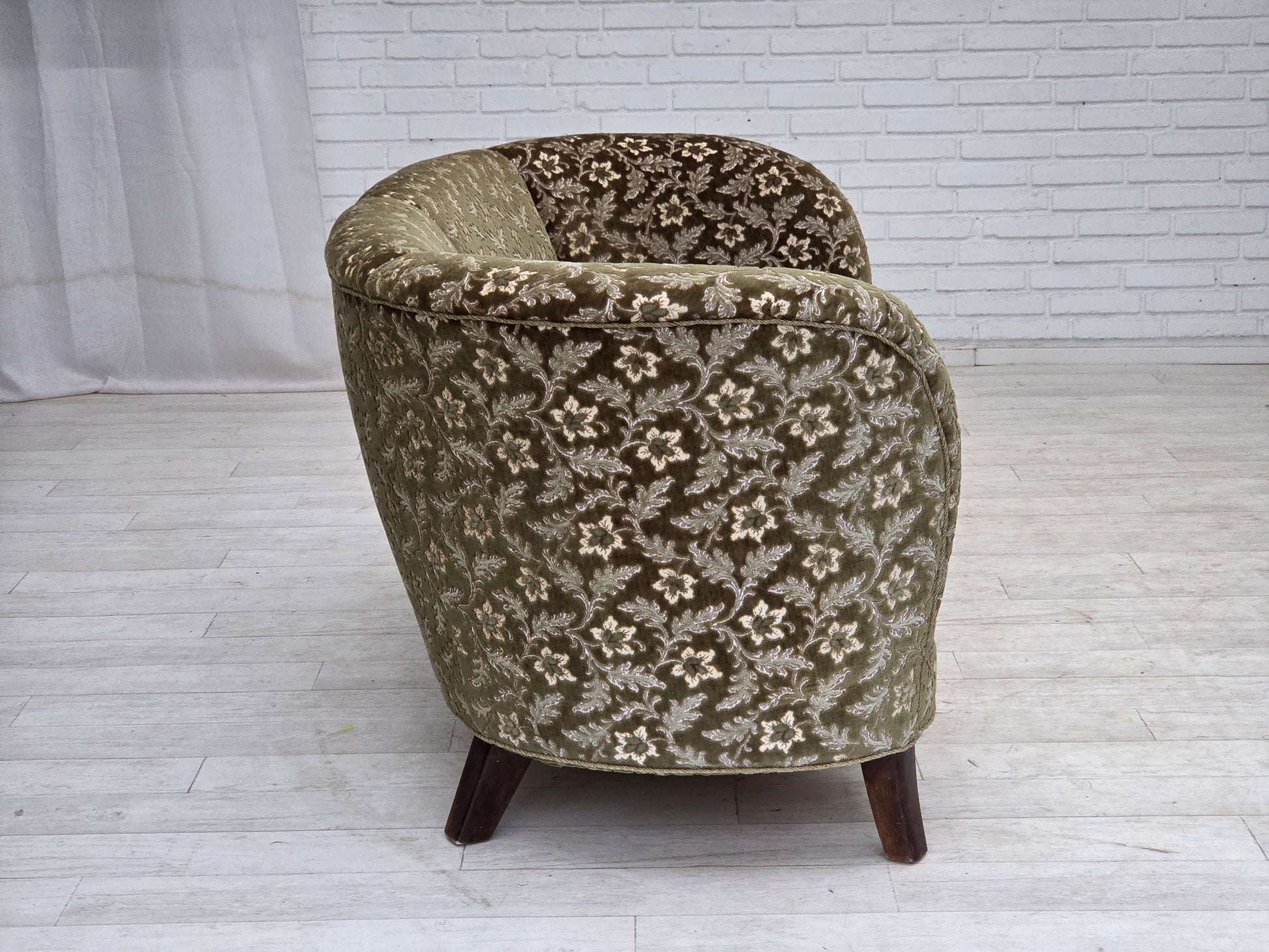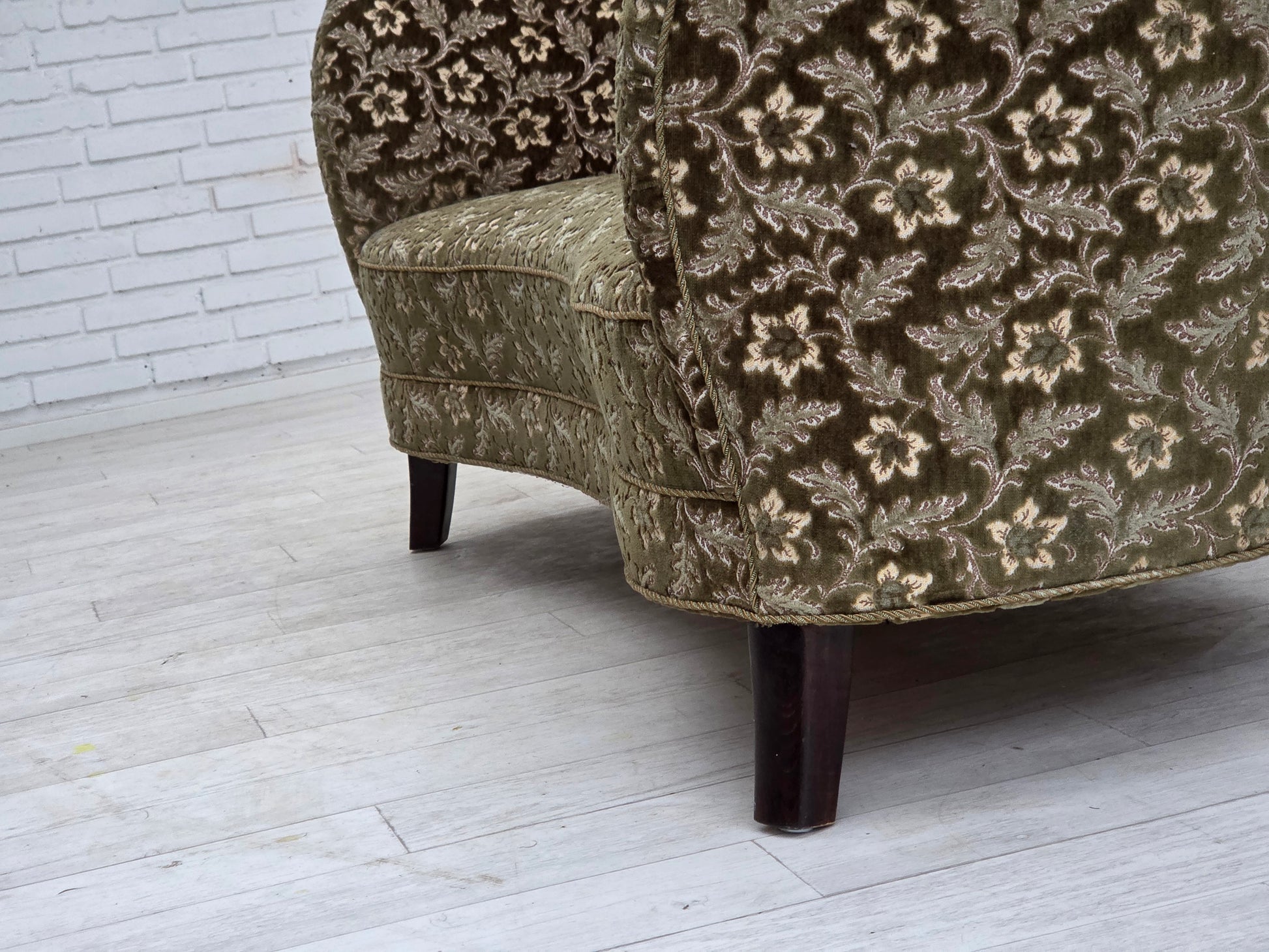 DESCRIPTION: 1960s, Danish curved 2-seater sofa. Green furniture velour, beech wood legs, brass springs in the seat. Sofa was reupholstered about 10 years ago by craftsman. Very good condition: no smells, no stains and stable construction. Manufactured by Danish furniture maker in about 1960-65s. Original Scandinavian vintage design directly from Denmark.