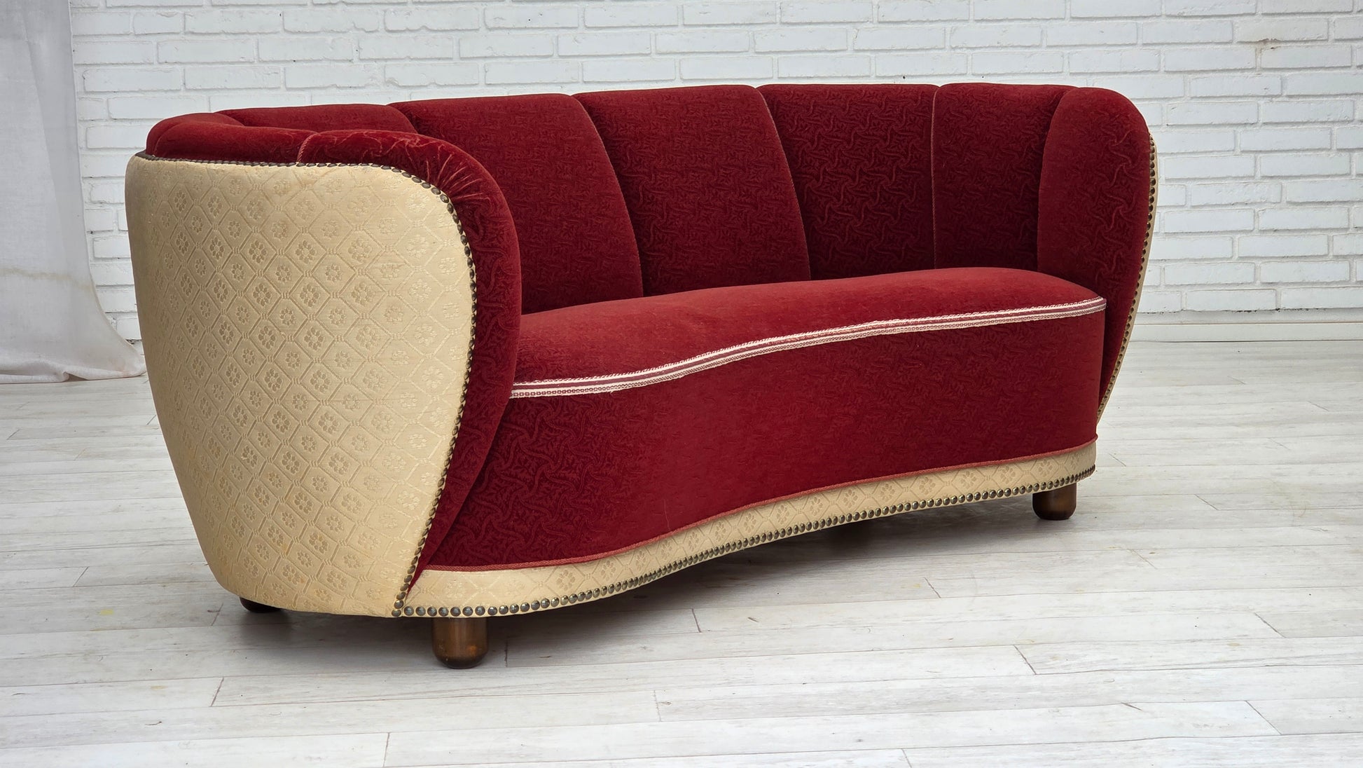 1960s, Danish curved 2-seater sofa, red/beige furniture wool fabric.