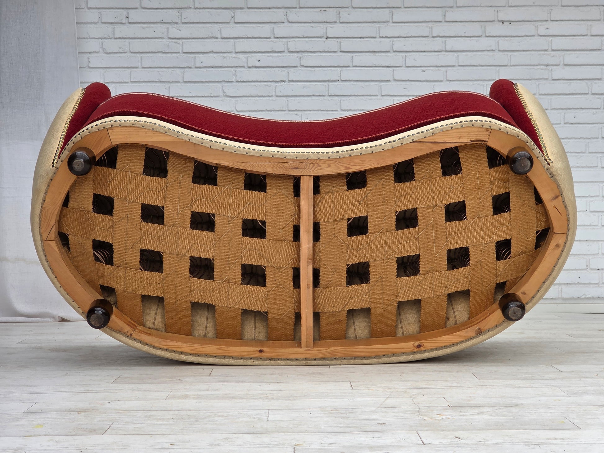 DESCRIPTION: 1960s, Danish curved 2-seater sofa. Original red and beige furniture wool fabric, brass springs in the seat, beech wood legs. Original good condition: no smells, no stains and stable construction. Manufactured by Danish furniture maker in about 1960-65s. Original Scandinavian vintage design directly from Denmark. The sofa was checked by craftsman.