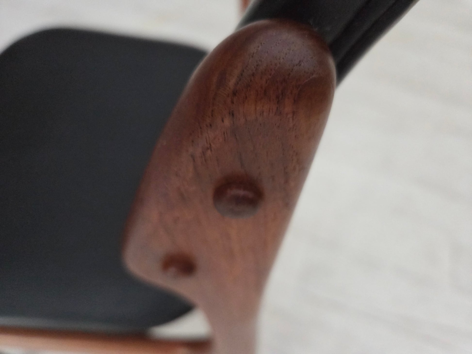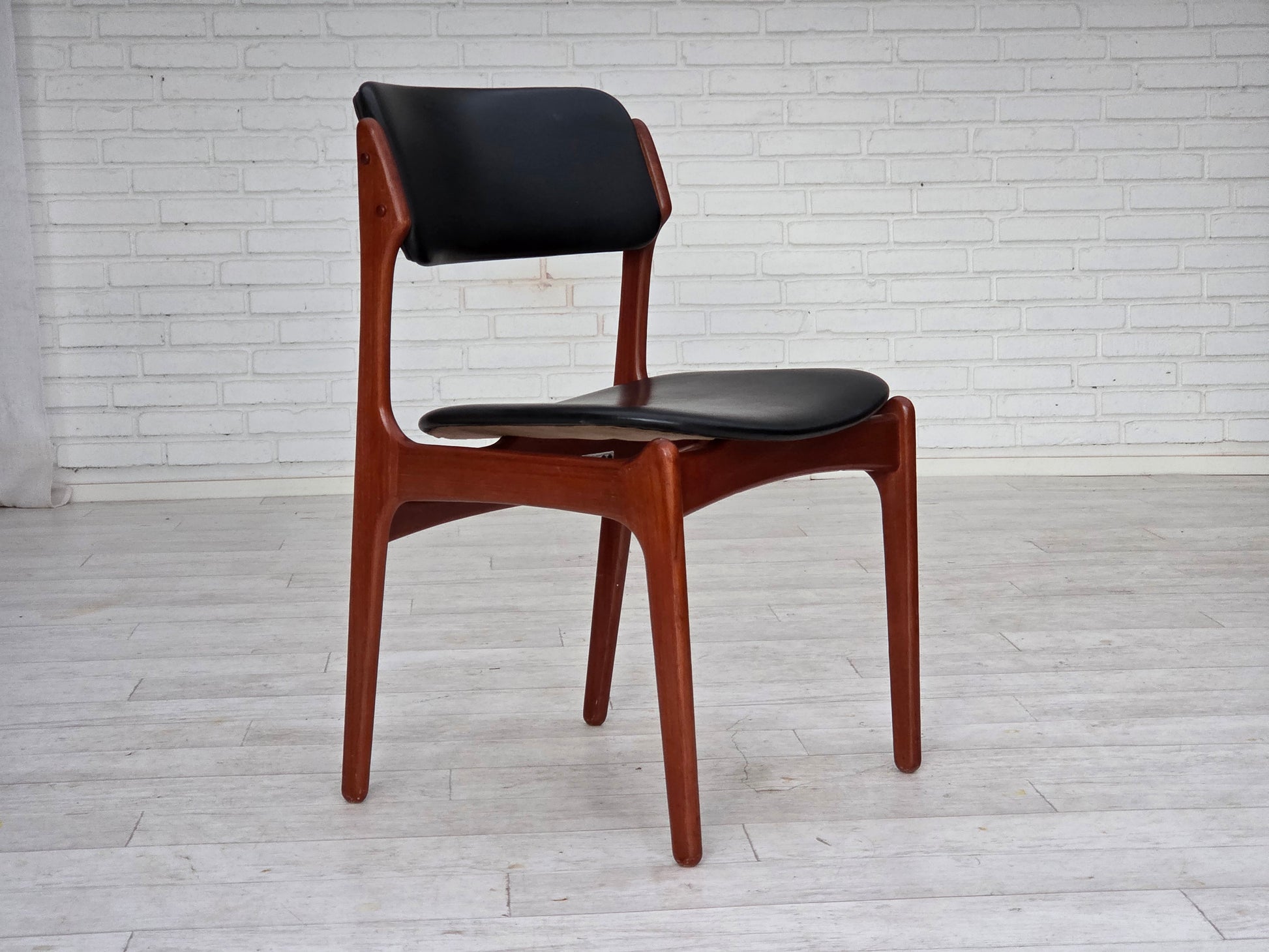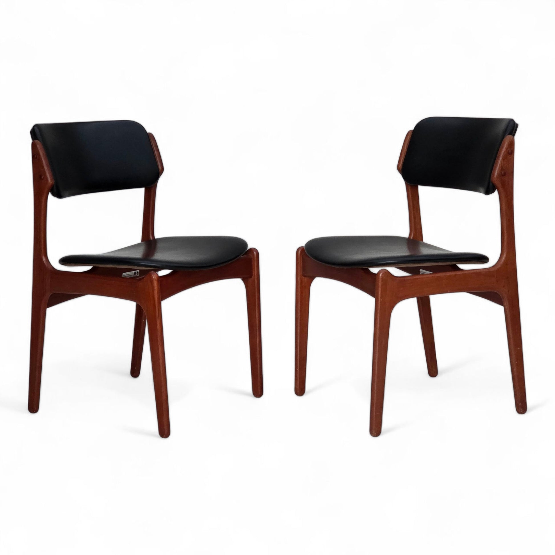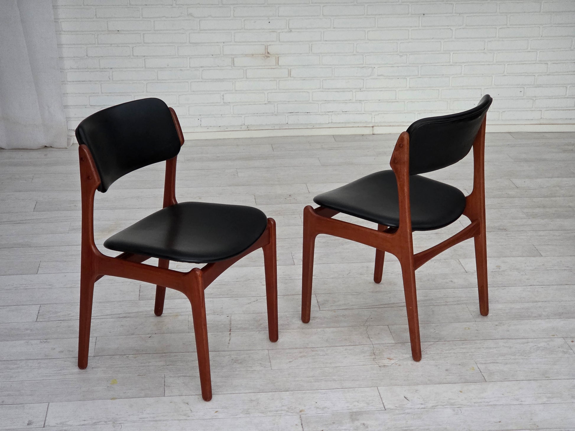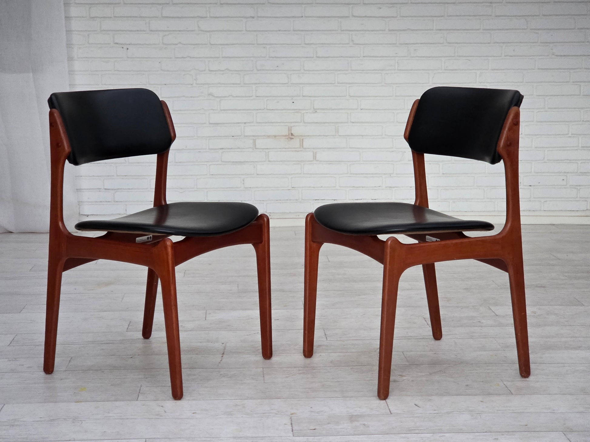 DESCRIPTION: 1960s, Danish design by Erik Buch, model 49. Pair of dining chairs. Teak wood, black furniture leather. Manufactured by Danish furniture maker Odense Maskinsnedkeri in about 1960-65s. Original Scandinavian vintage design directly from Denmark. The chairs were checked by craftsman.
