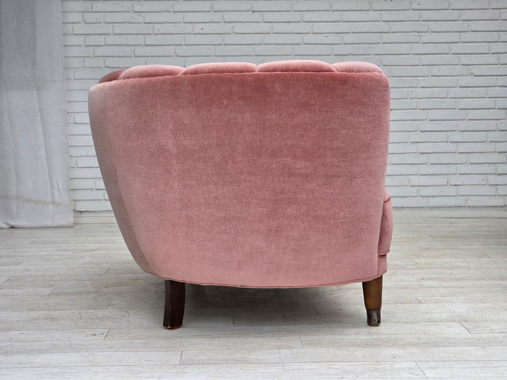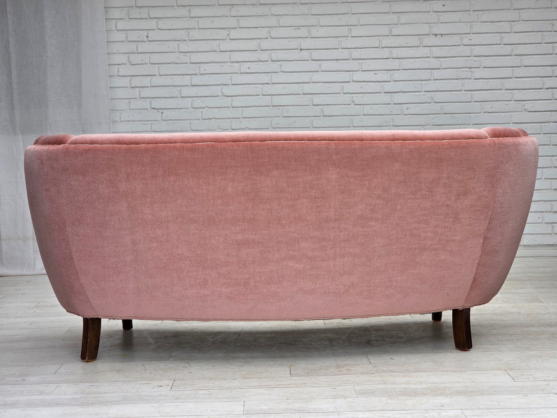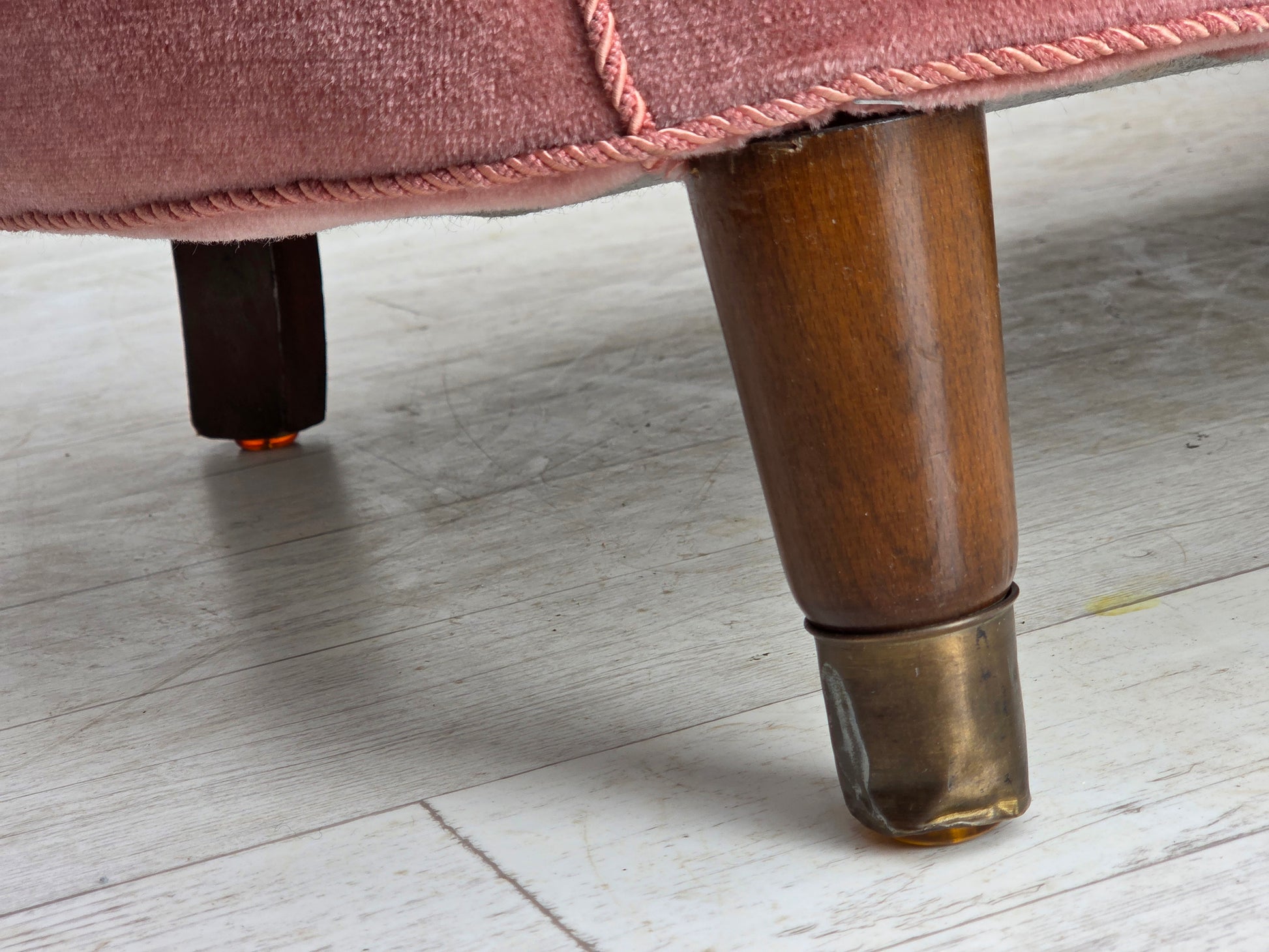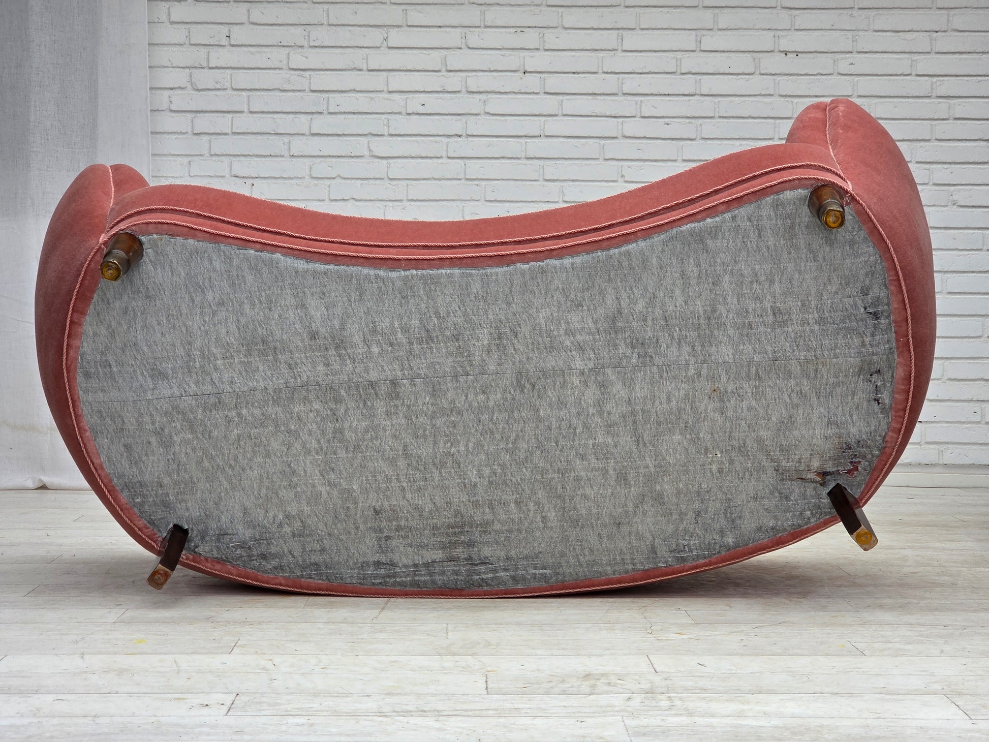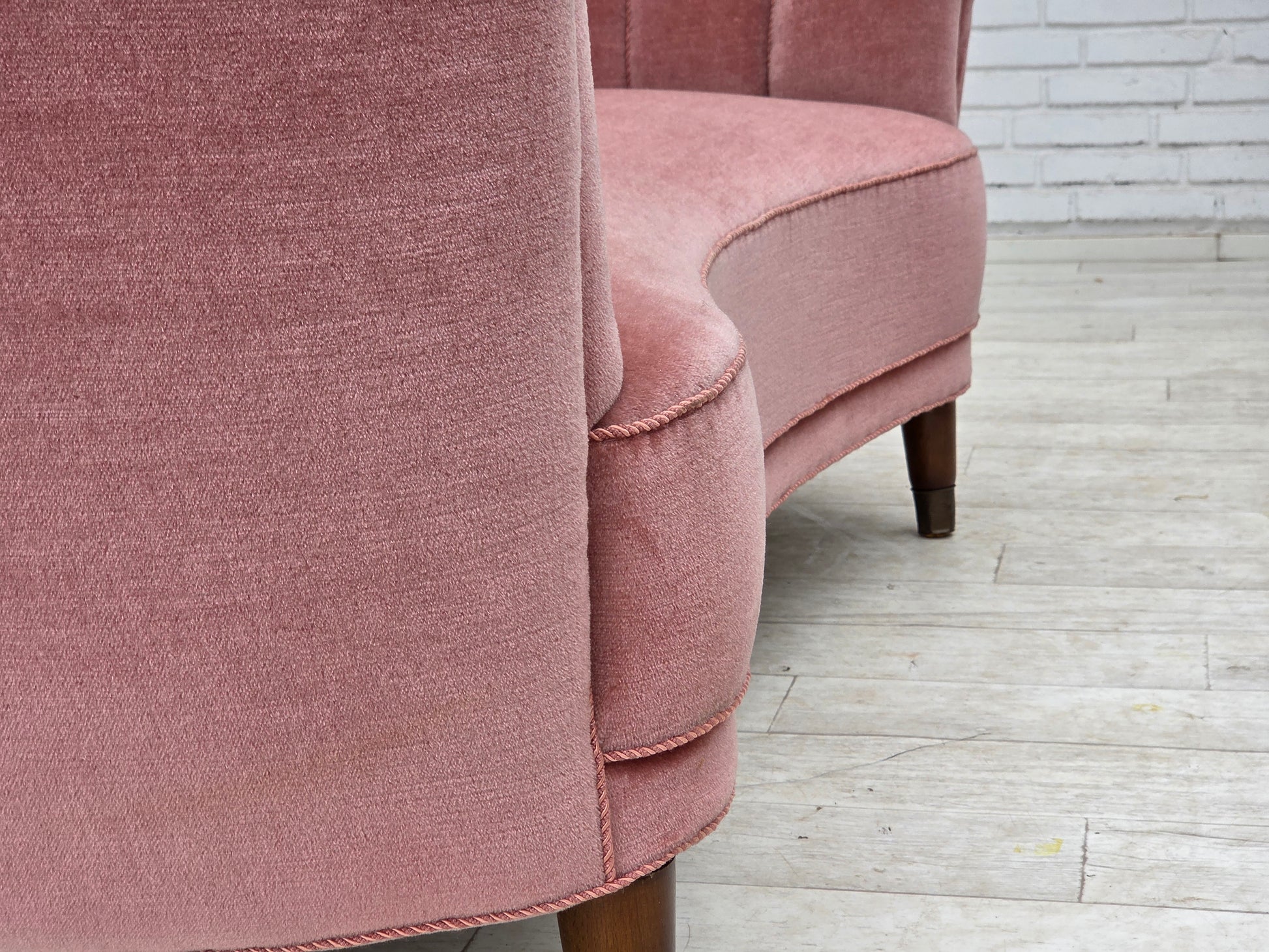 DESCRIPTION: 1970s, Danish 2-seater curved sofa. Original salmon pink furniture velour, beech wood legs with brass plugs, springs in the seat. Original very good condition: no smells, no stains and stable construction. Manufactured by Danish furniture maker in about 1970-75s. Original Scandinavian vintage design directly from Denmark. The sofa was checked by craftsman.