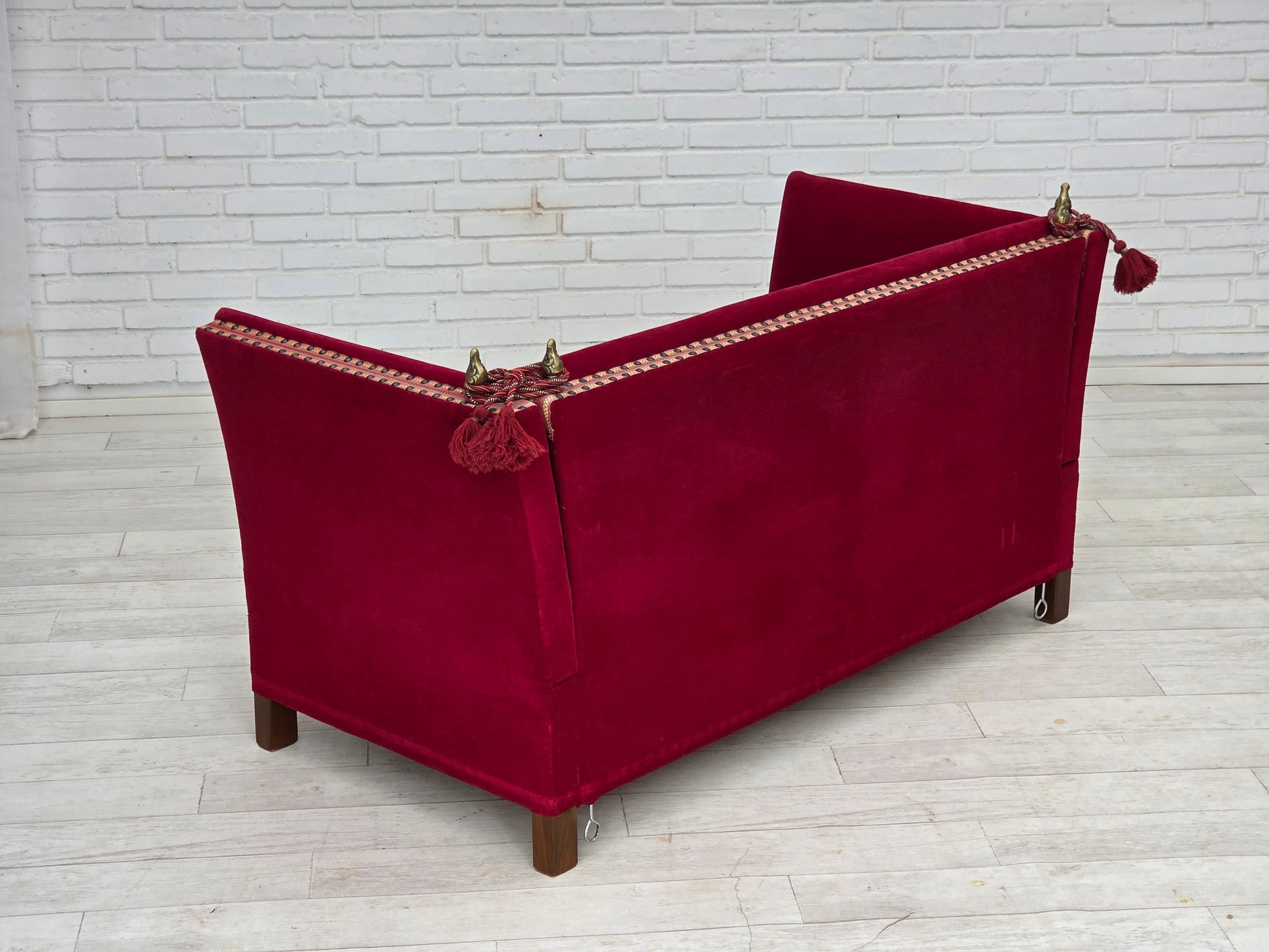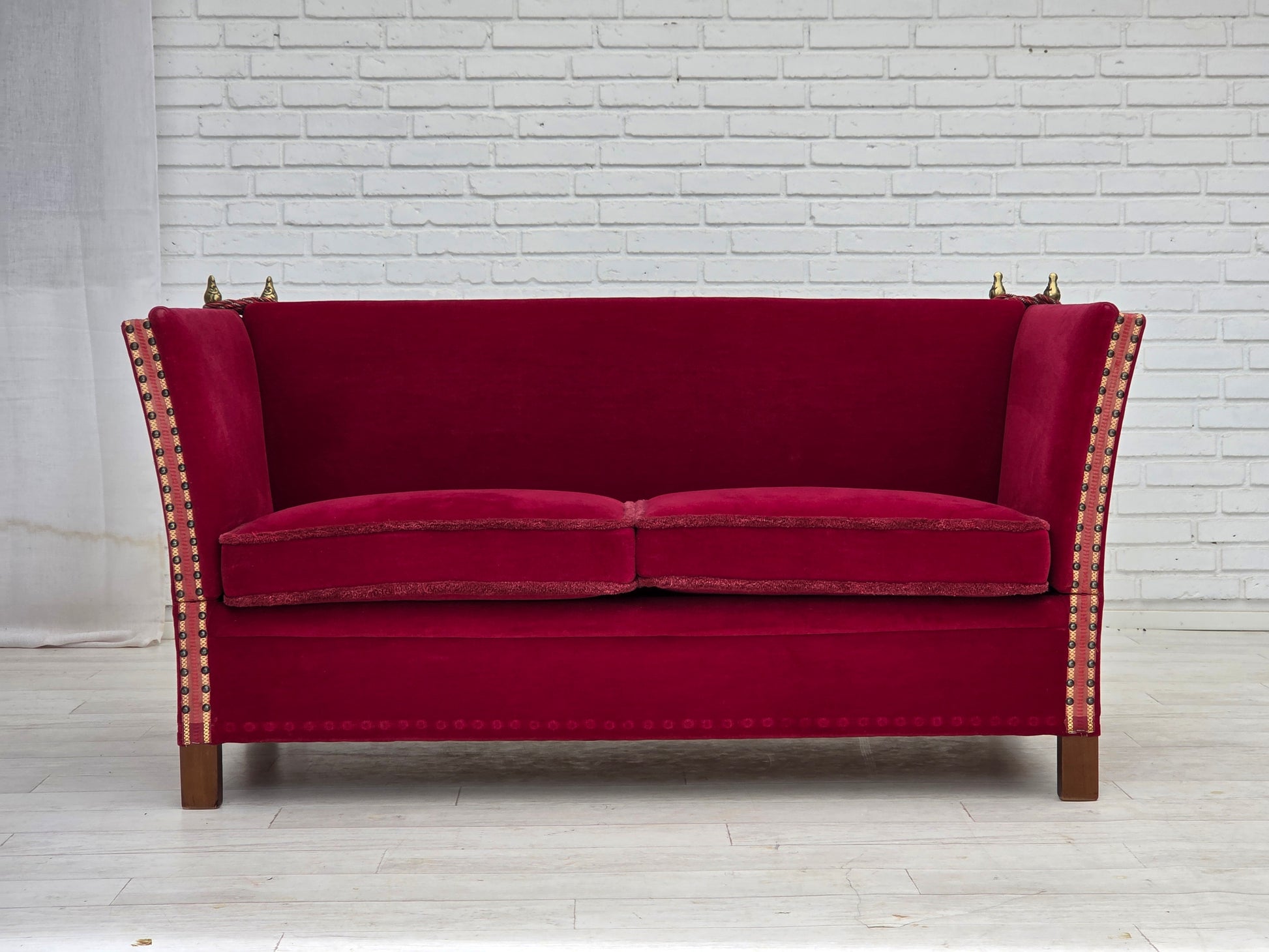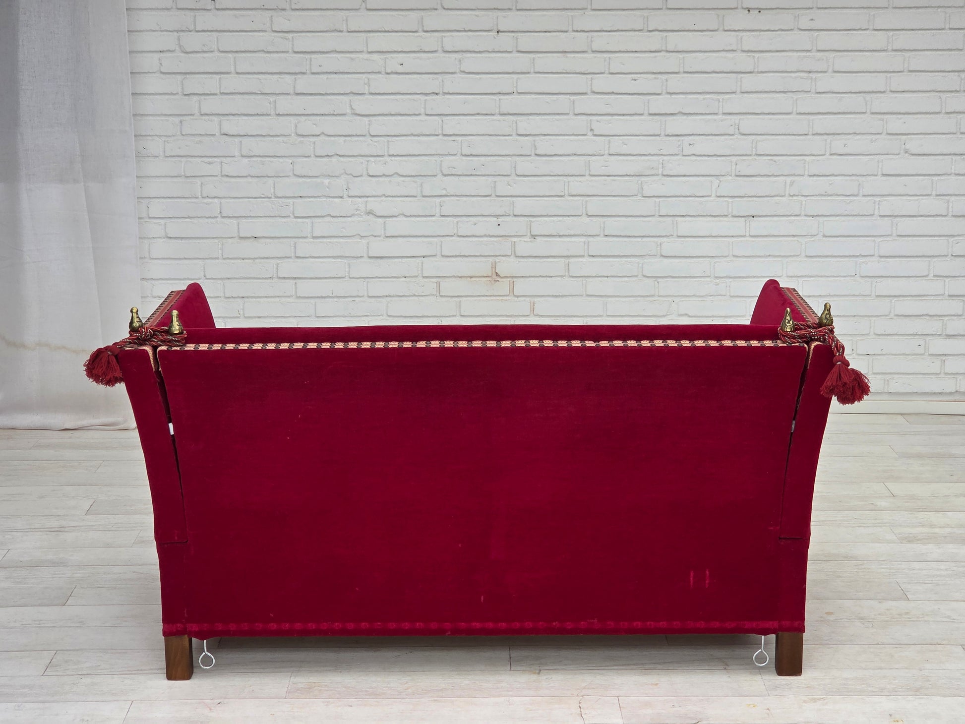 1970s, Danish 2-seater "Spanish" drop arm sofa, cherry-red furniture velour.