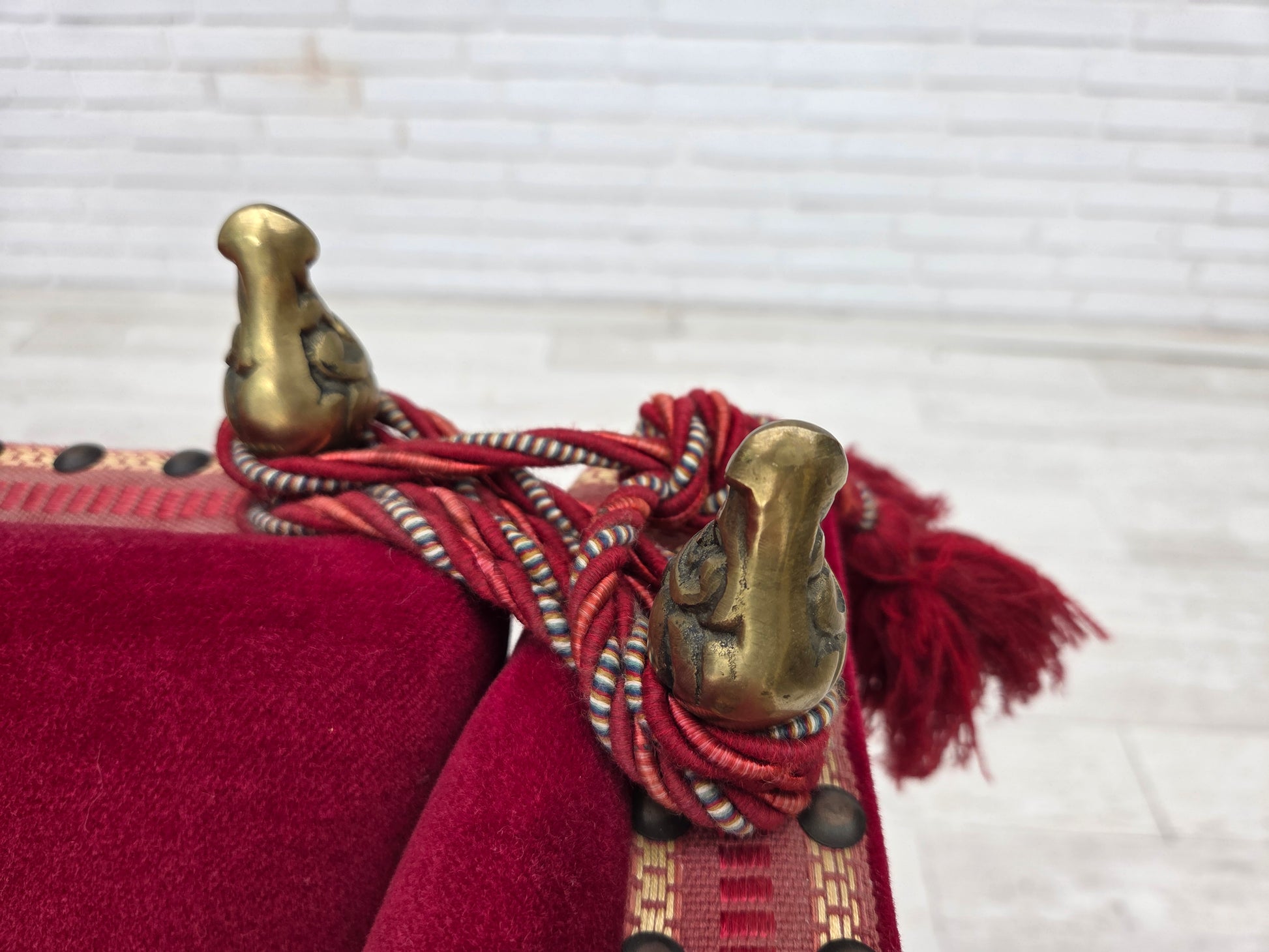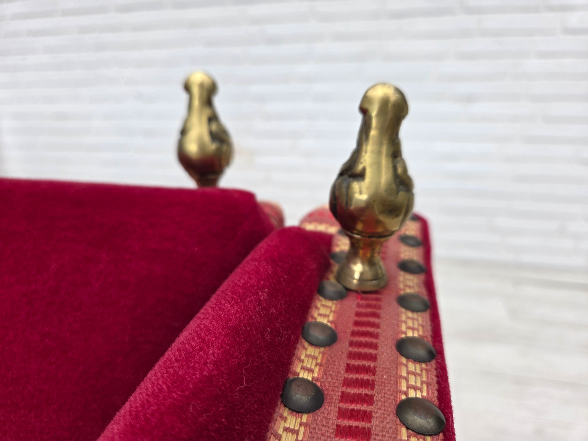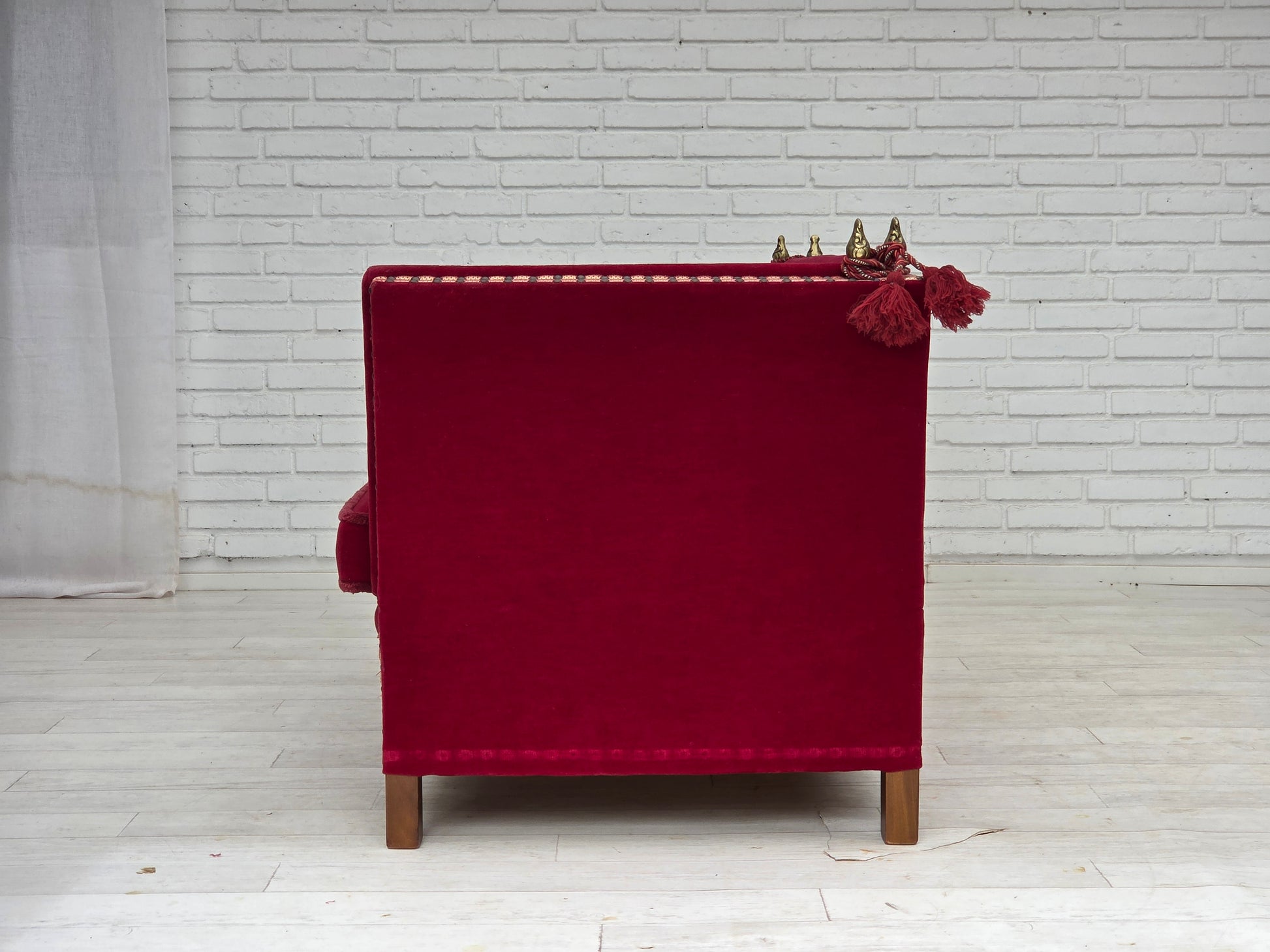 1970s, Danish 2-seater "Spanish" drop arm sofa, cherry-red furniture velour.