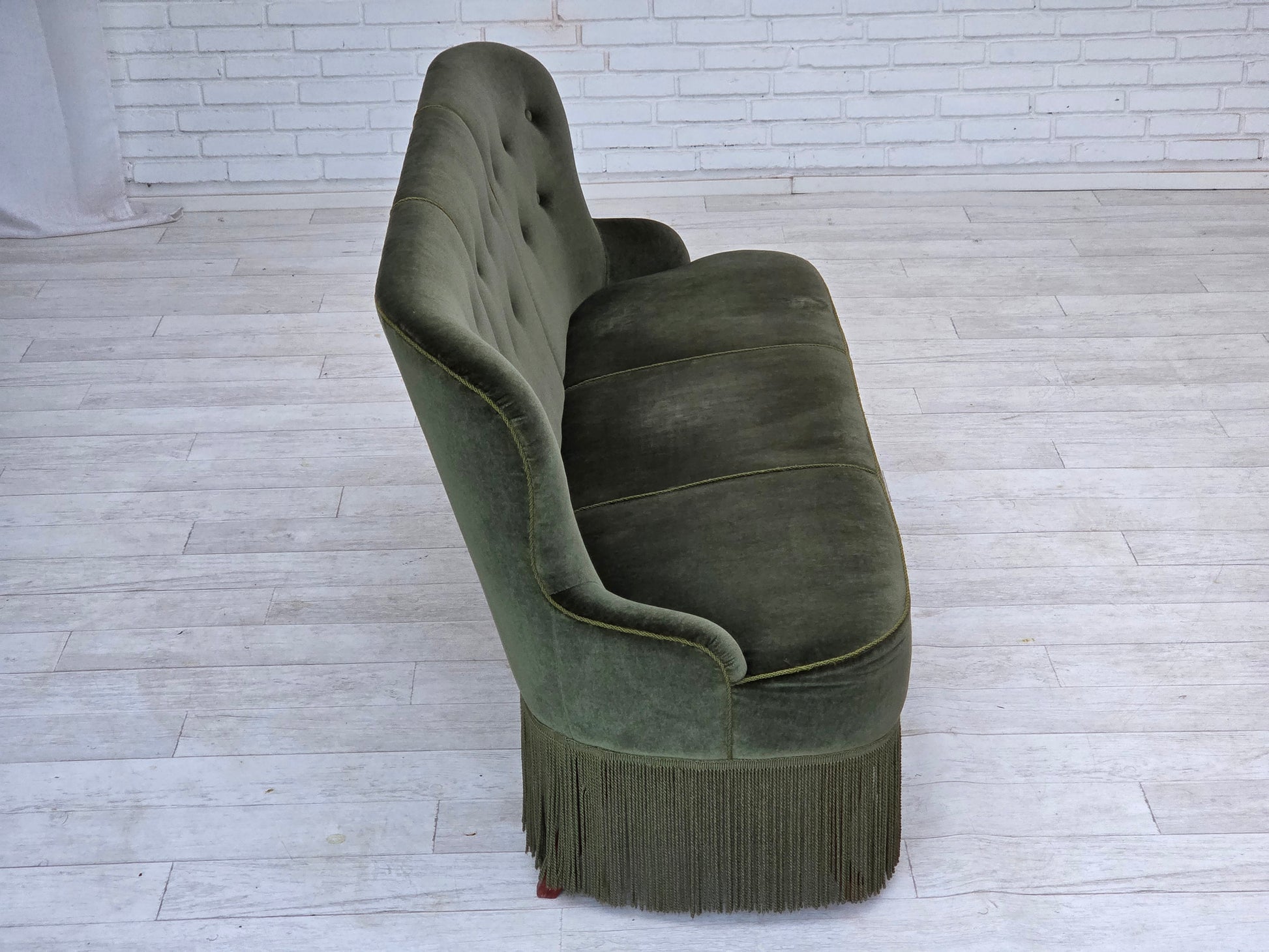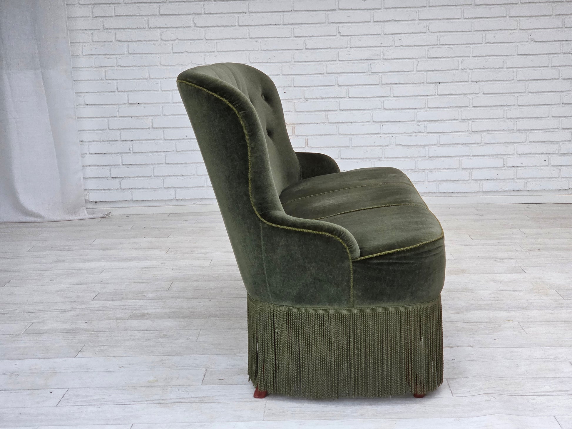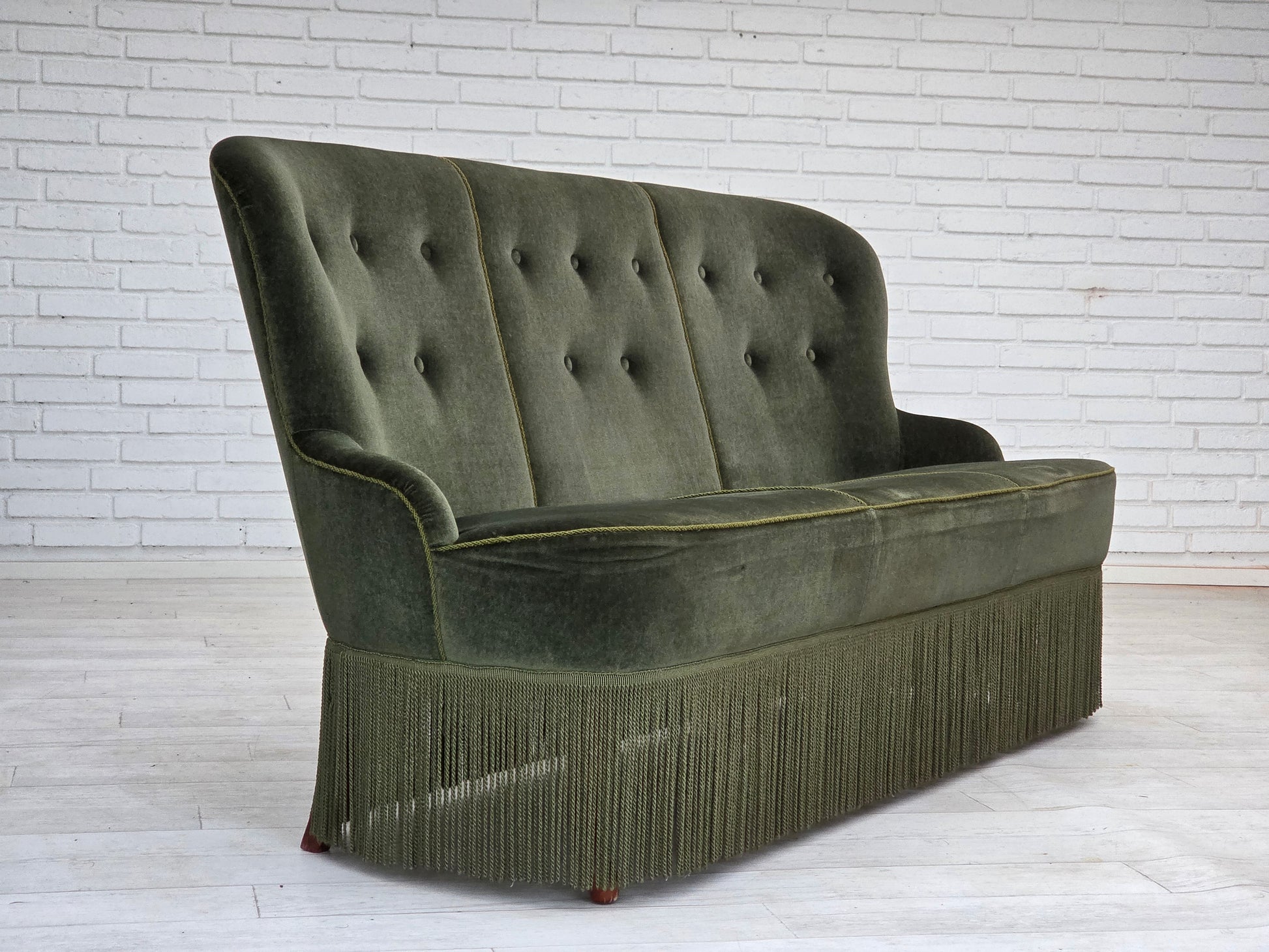DESCRIPTION: 1970s, Danish 3-seater sofa. Original green furniture velour, beech wood legs. Original good condition: no smells, no stains and stable construction. Professional small repair of fabric on the seat. Manufactured by Danish furniture maker in about 1975s. Original Scandinavian vintage design directly from Denmark. The sofa was checked by craftsman.