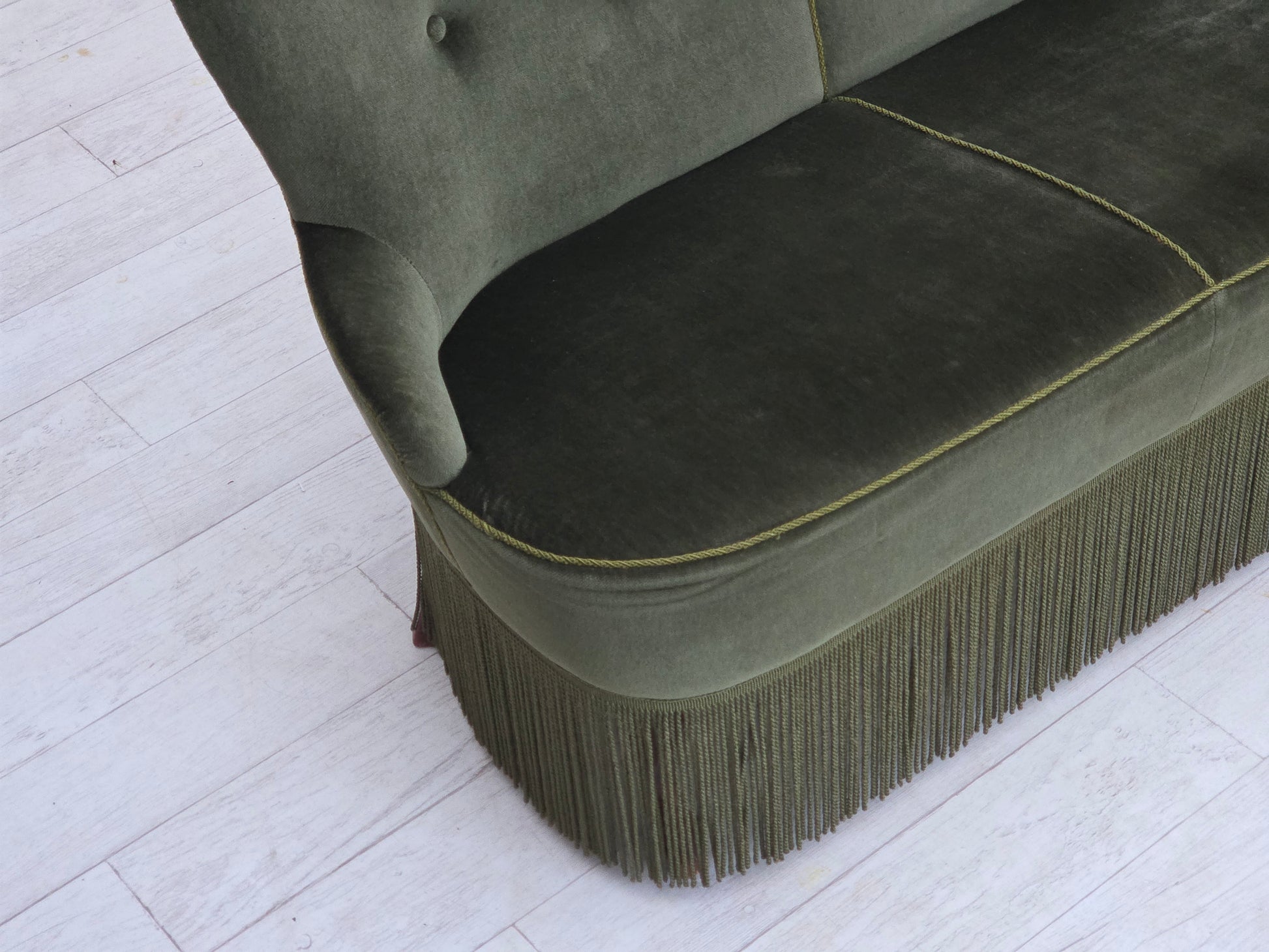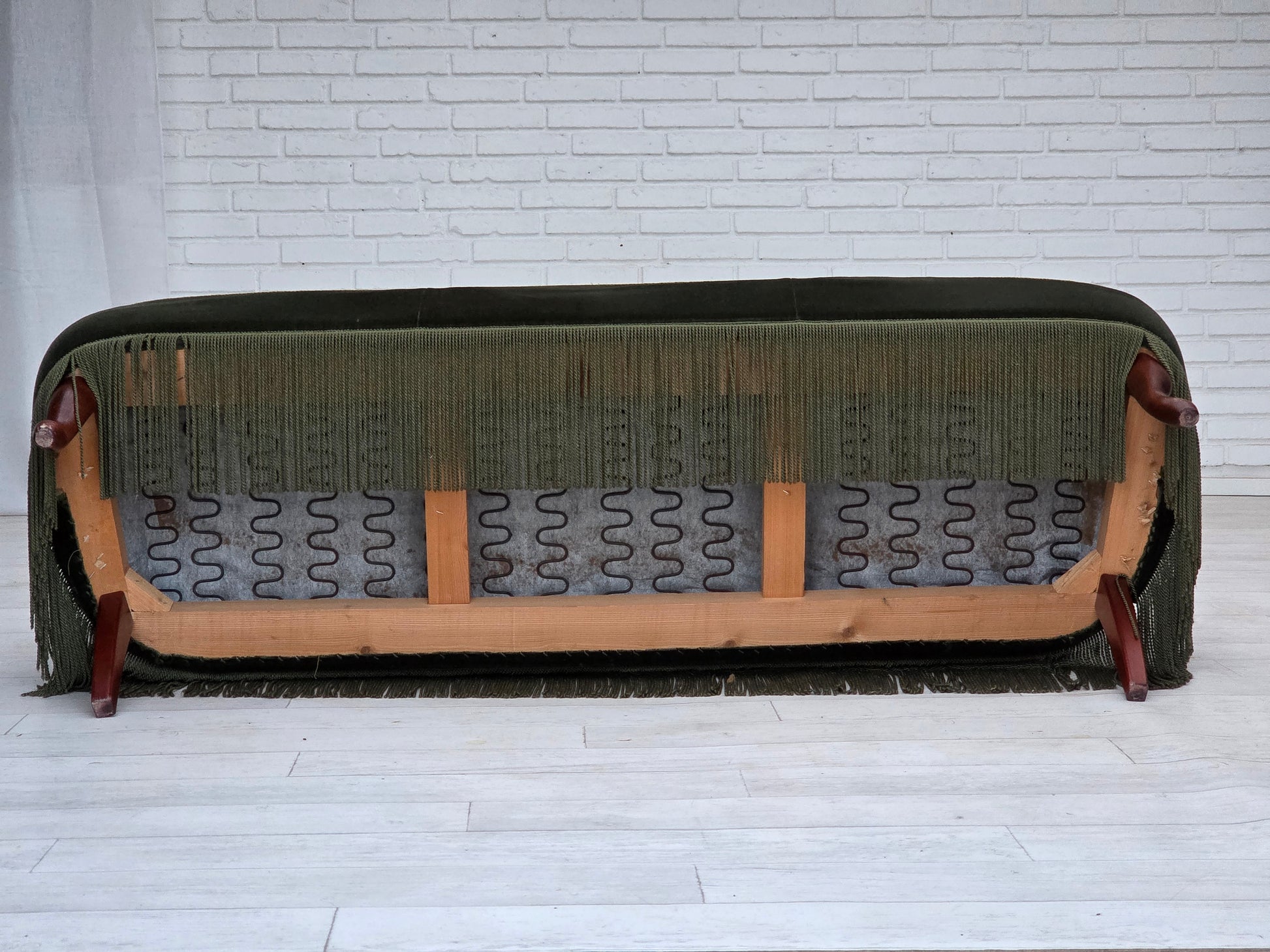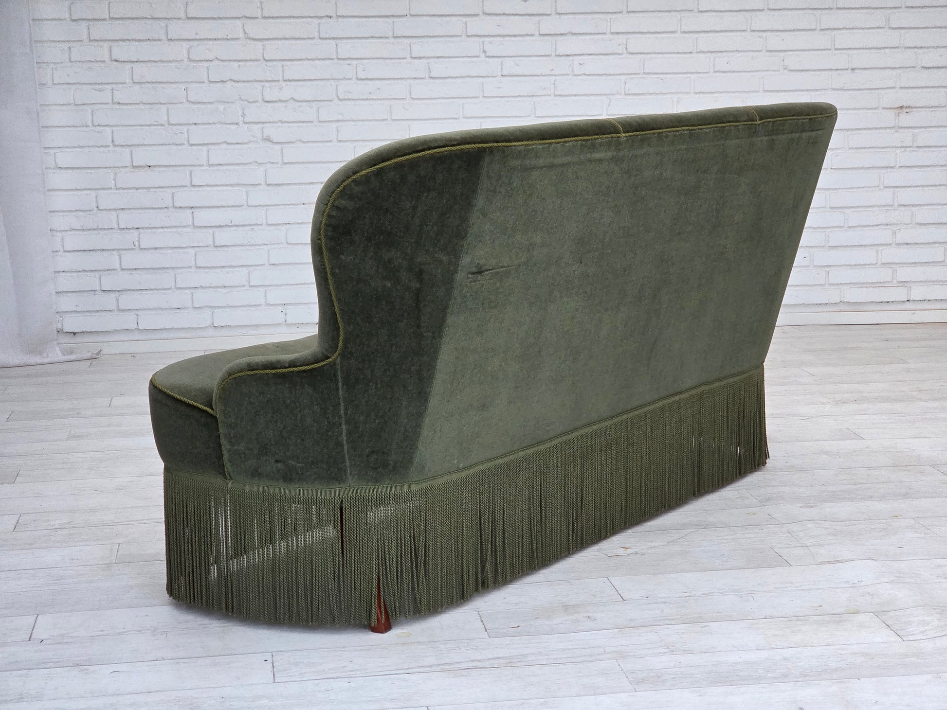 DESCRIPTION: 1970s, Danish 3-seater sofa. Original green furniture velour, beech wood legs. Original good condition: no smells, no stains and stable construction. Professional small repair of fabric on the seat. Manufactured by Danish furniture maker in about 1975s. Original Scandinavian vintage design directly from Denmark. The sofa was checked by craftsman.