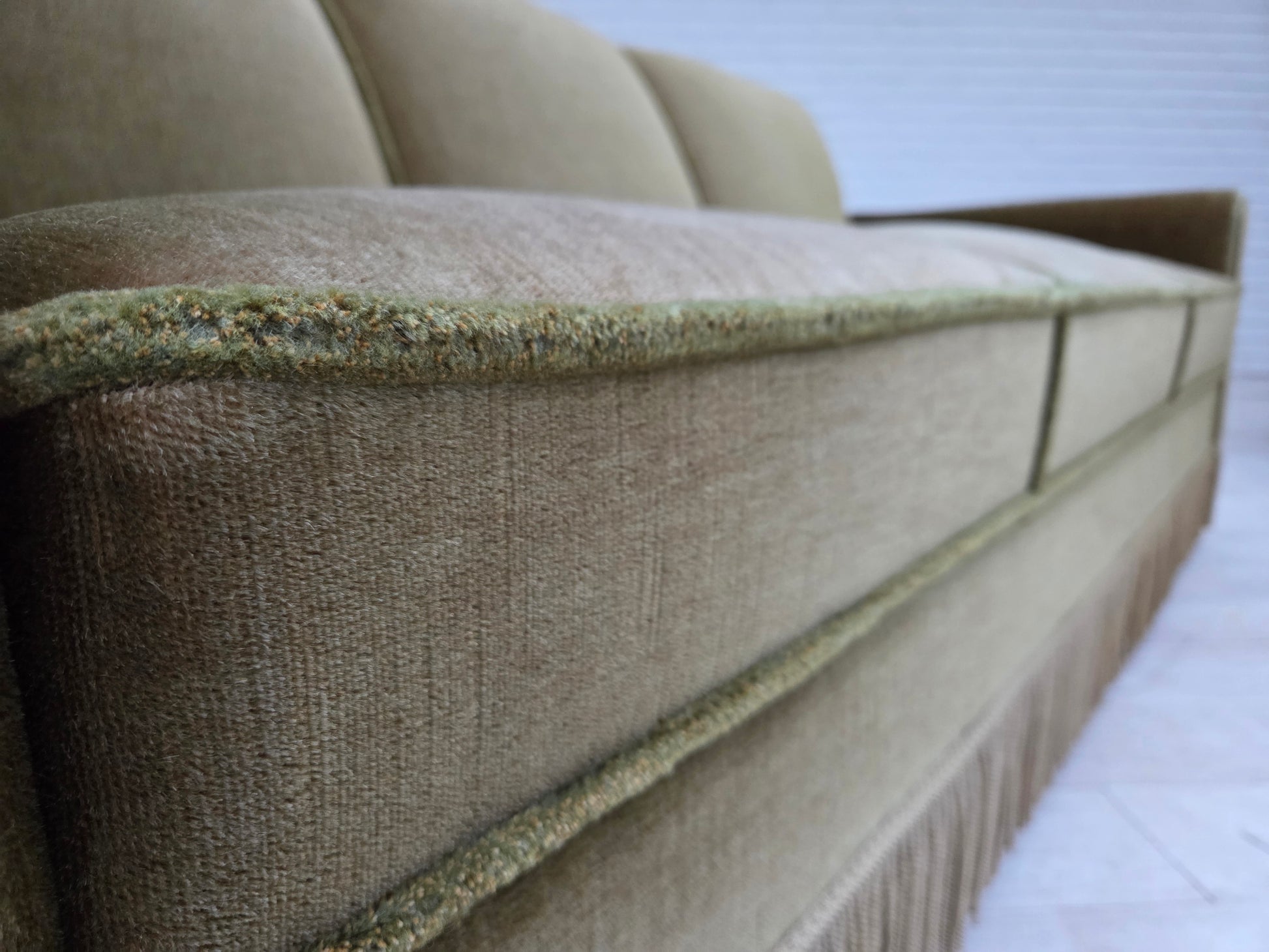 DESCRIPTION: 1970s, Danish 3-seater sofa. Original green furniture velour, teak wood legs, springs in the seat. Original very good condition: no smells, no stains and stable construction. Manufactured by Danish furniture maker in about 1970-75s. Original Scandinavian vintage design directly from Denmark. The sofa was checked by craftsman.
