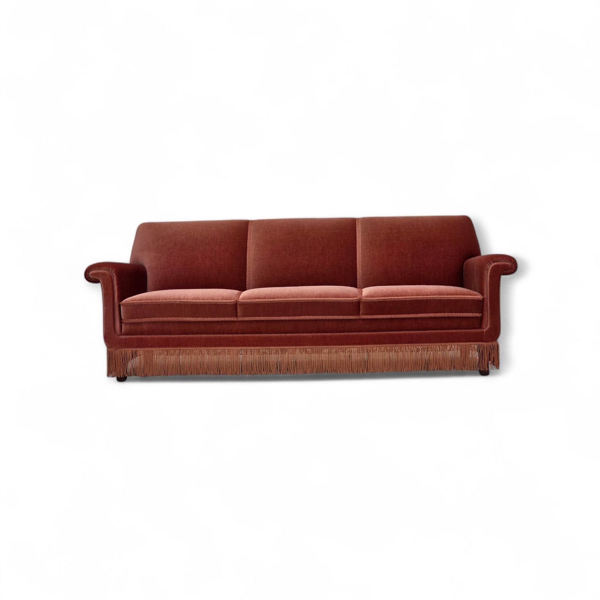 1970s, Danish 3-seater sofa, salmon pink furniture velour, beech wood.