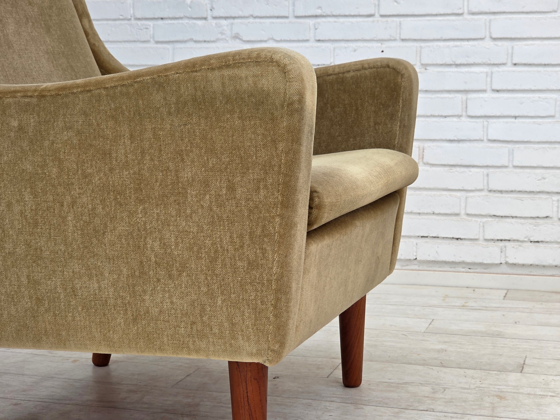 1970s, Danish armchair, original green furniture velour, teak wood legs.