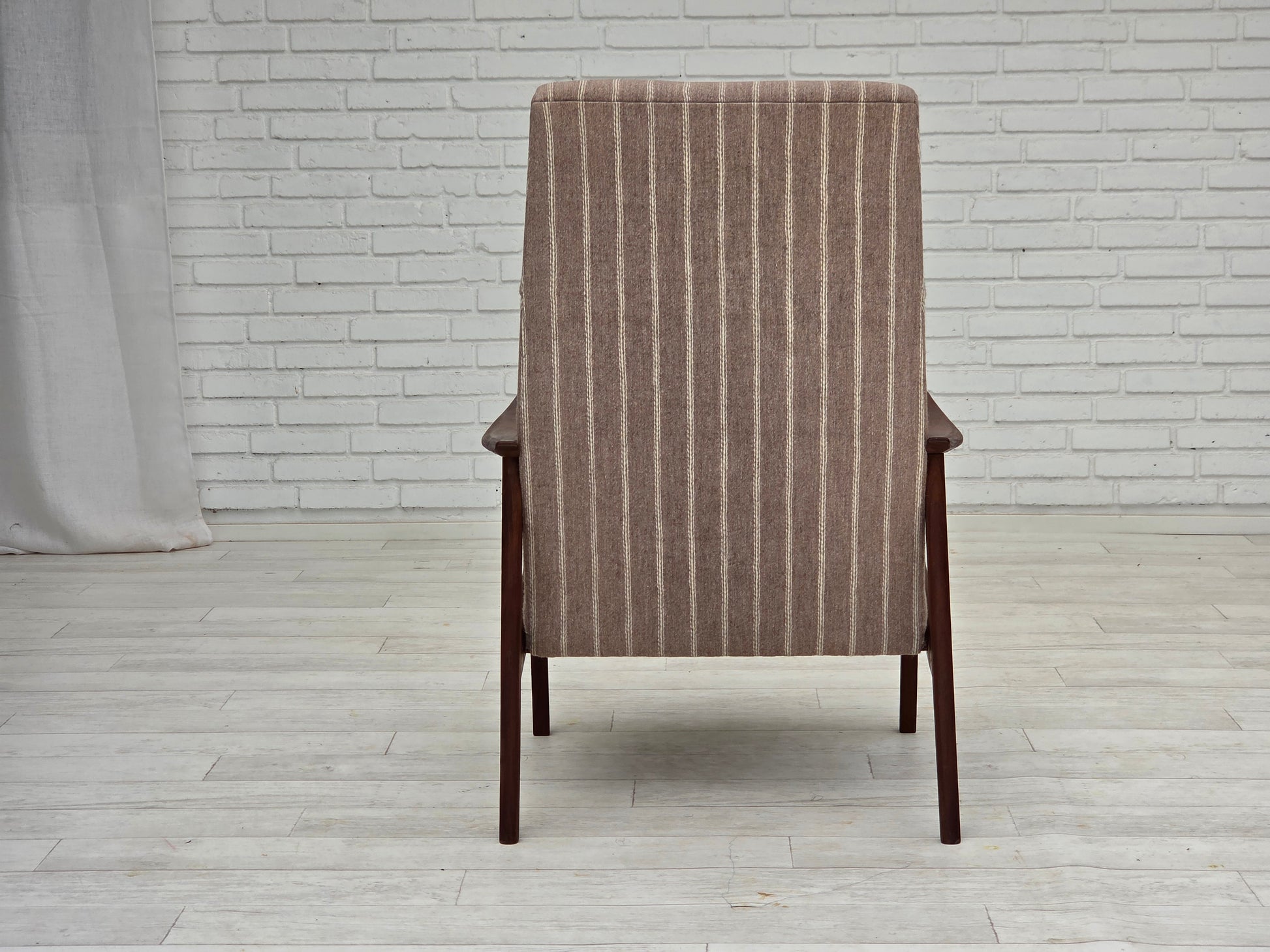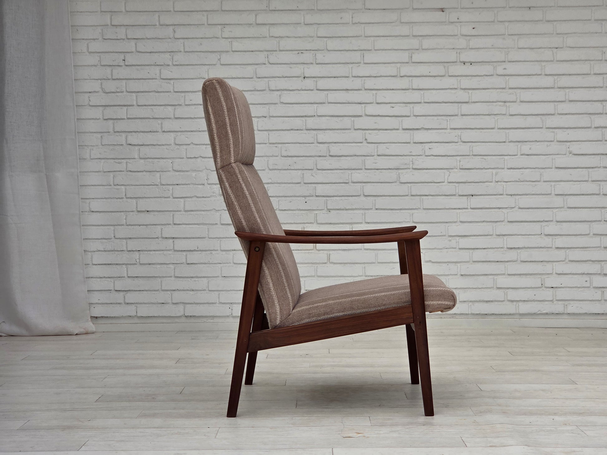 DESCRIPTION: 1970s, Danish highback armchair. Original light brown furniture wool with white stripes. Renewed solid teak wood. Original very good condition: no smells, no stains and stable construction. Manufactured by Danish furniture maker in about 1970-75s. Original Scandinavian vintage design directly from Denmark. The chair was checked by craftsman.