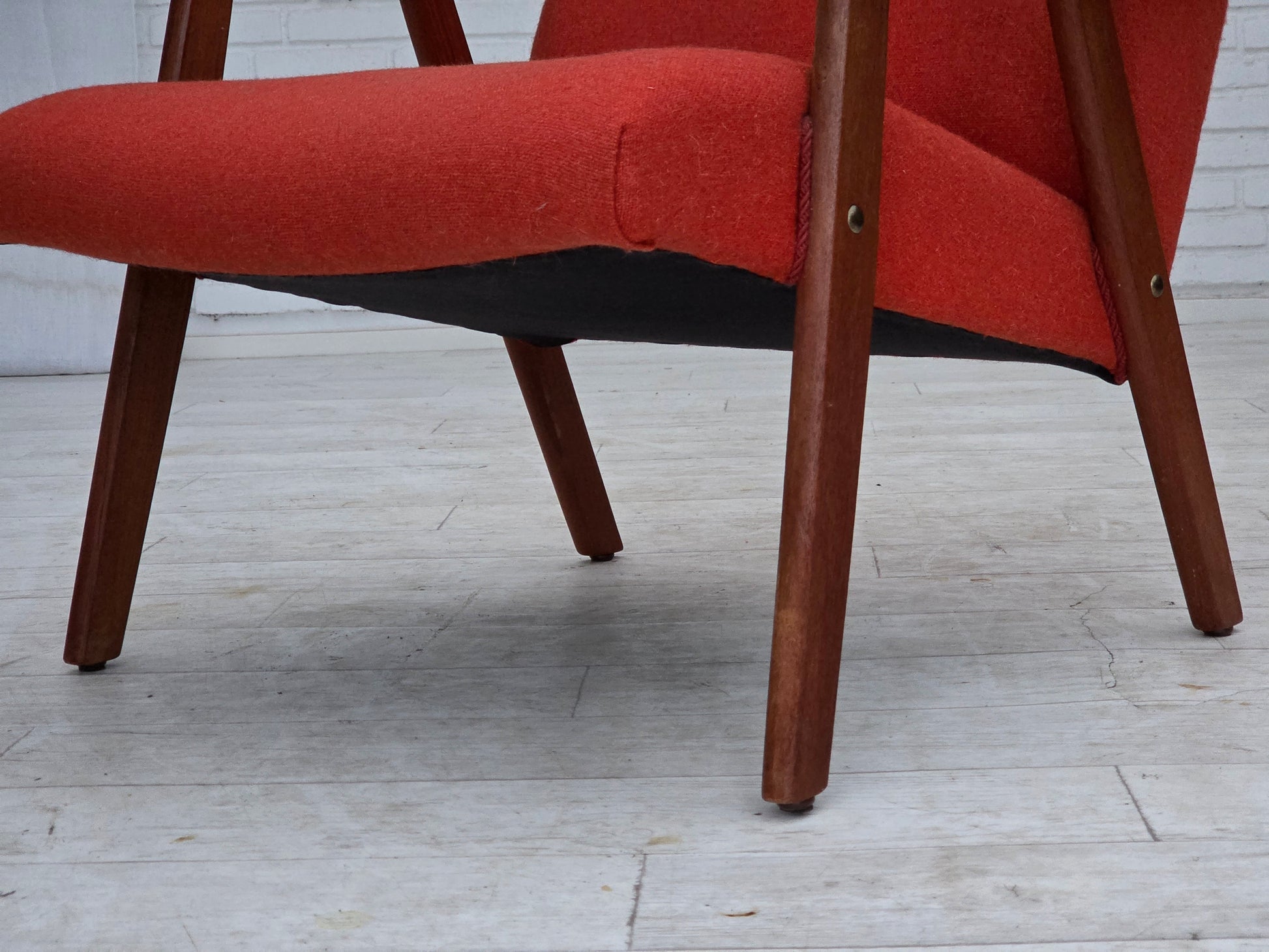 DESCRIPTION: 1970s, Danish highback armchair. Orange furniture wool, teak wood, oak wood. Chair was reupholstered by craftsman about 10 years ago. Very good condition: no smells, no stains and stable construction. Manufactured by Danish furniture maker in about 1965-70s. Original Scandinavian vintage design directly from Denmark. The chair was checked by craftsman.