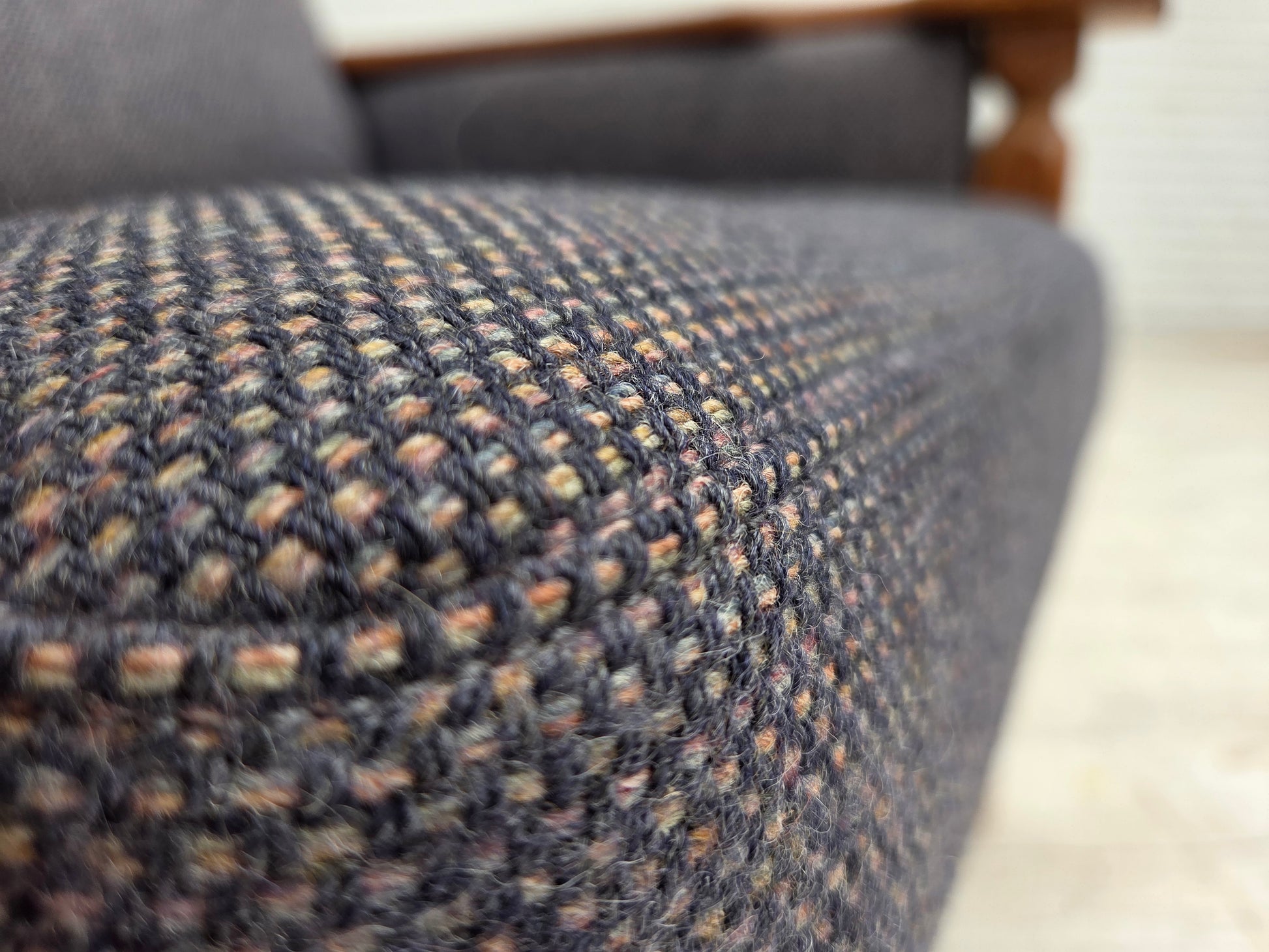 1970s, highback Danish armchair with footstool, furniture wool fabric, solid oak wood.