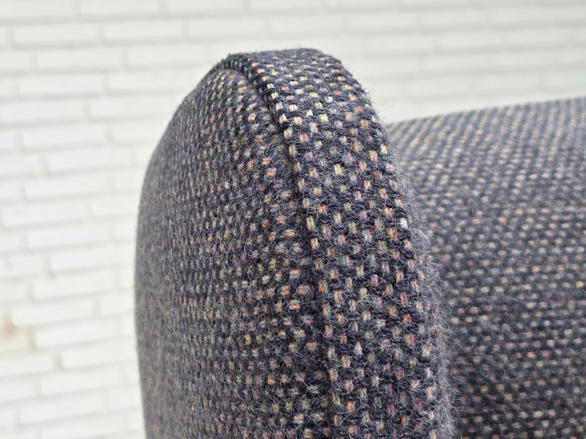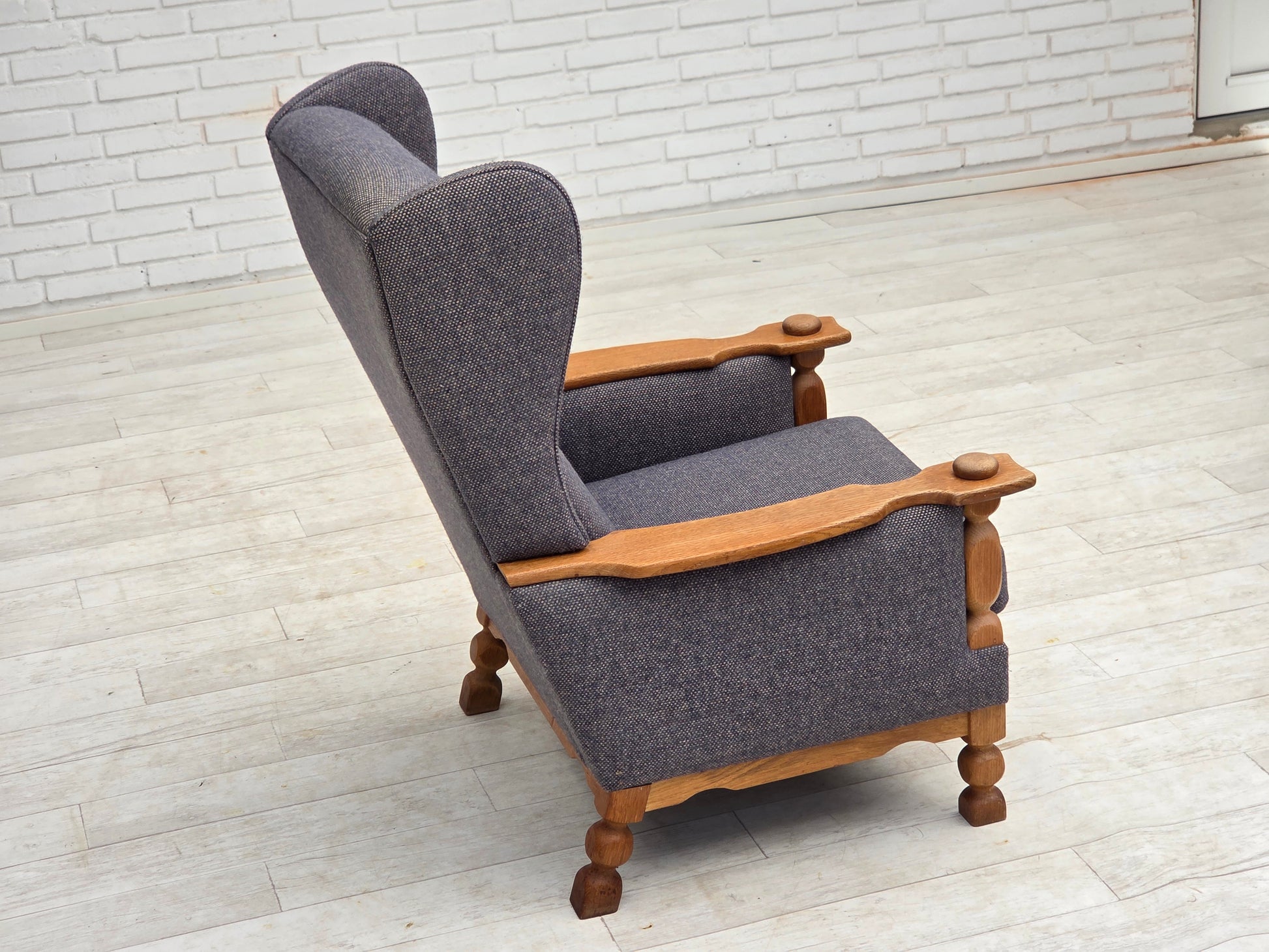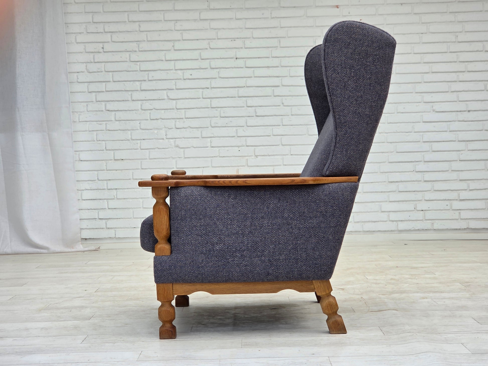 DESCRIPTION: 1970s, highback Danish armchair with footstool. Blue/gray furniture wool fabric, solid oak wood, springs in the seat cushion. The chair was reupholstered by craftsman about 10 years ago. Very good condition: no smells, no stains and stable construction. Manufactured by Danish furniture maker in about 1970-75s. Original Scandinavian vintage design directly from Denmark.