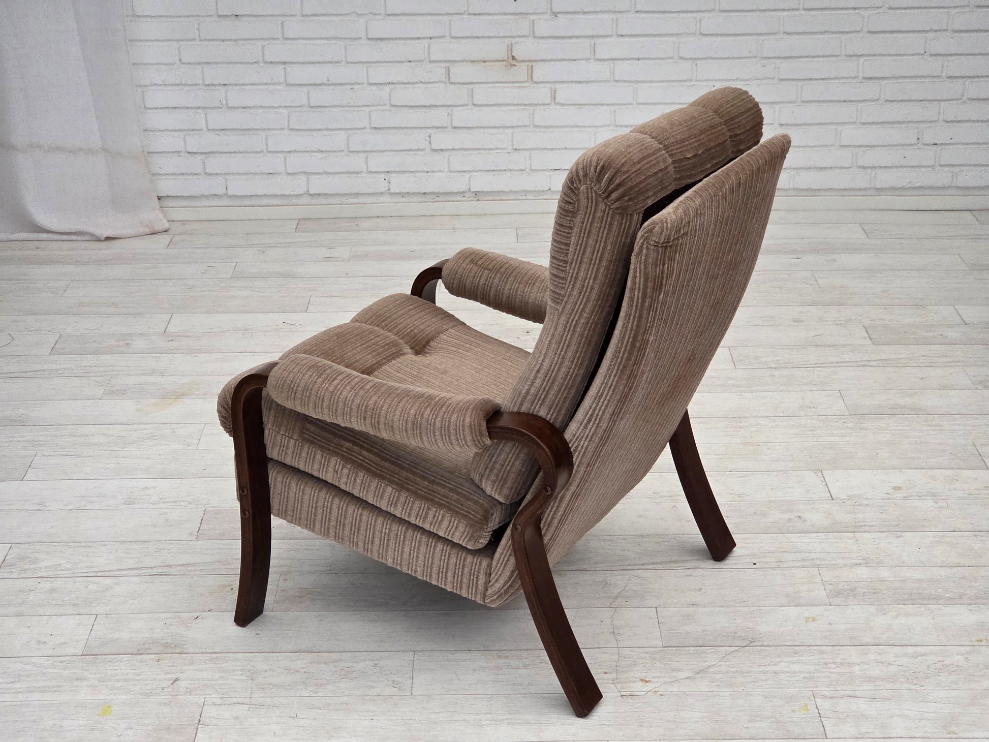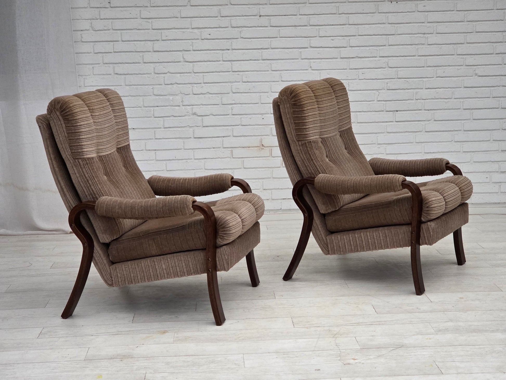 DESCRIPTION: 1970s, pair of Danish armchairs. Light brown furniture corduroy, dark beech wood. Original very good condition: no smells, no stains and stable construction. Manufactured by Danish furniture maker in about 1975-80s. Original Scandinavian vintage design directly from Denmark. The chairs were checked by craftsman.