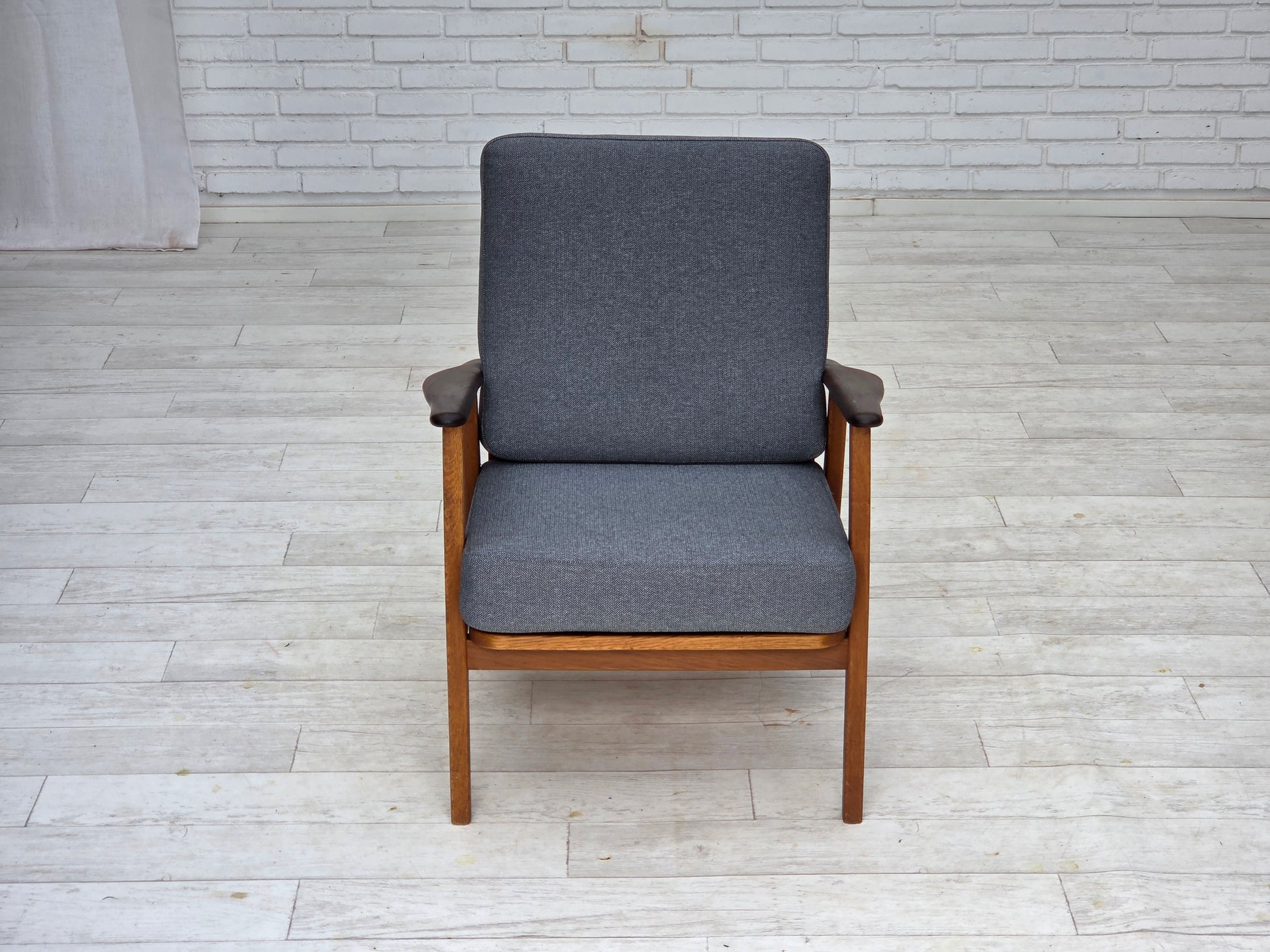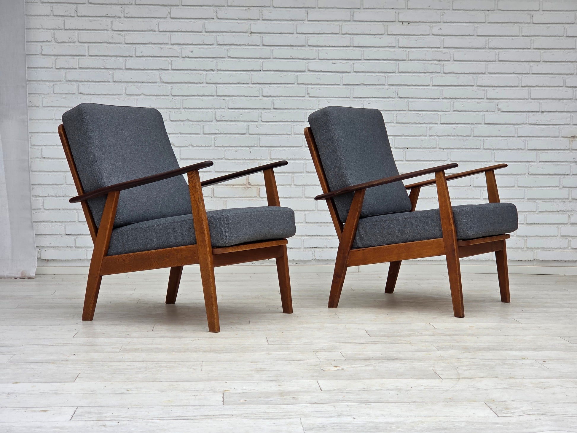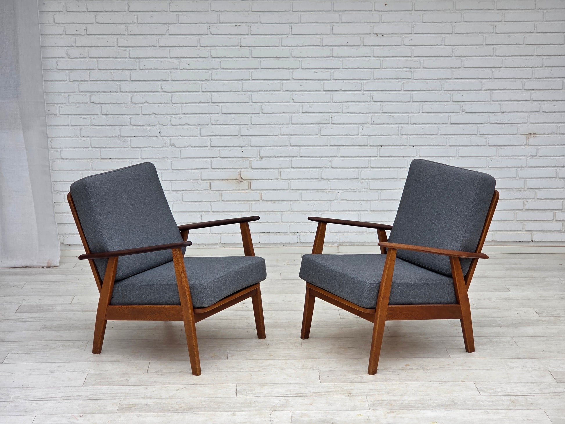 DESCRIPTION: 1970s, pair of Danish armchairs. New reupholstered, wood renewed. Quality blue furniture wool, teak wood armrests, oak wood legs. Springs in the seat cushions. Manufactured by Danish furniture maker in about 1970-75s. Reupholstered by craftsman. Original Scandinavian vintage design directly from Denmark.