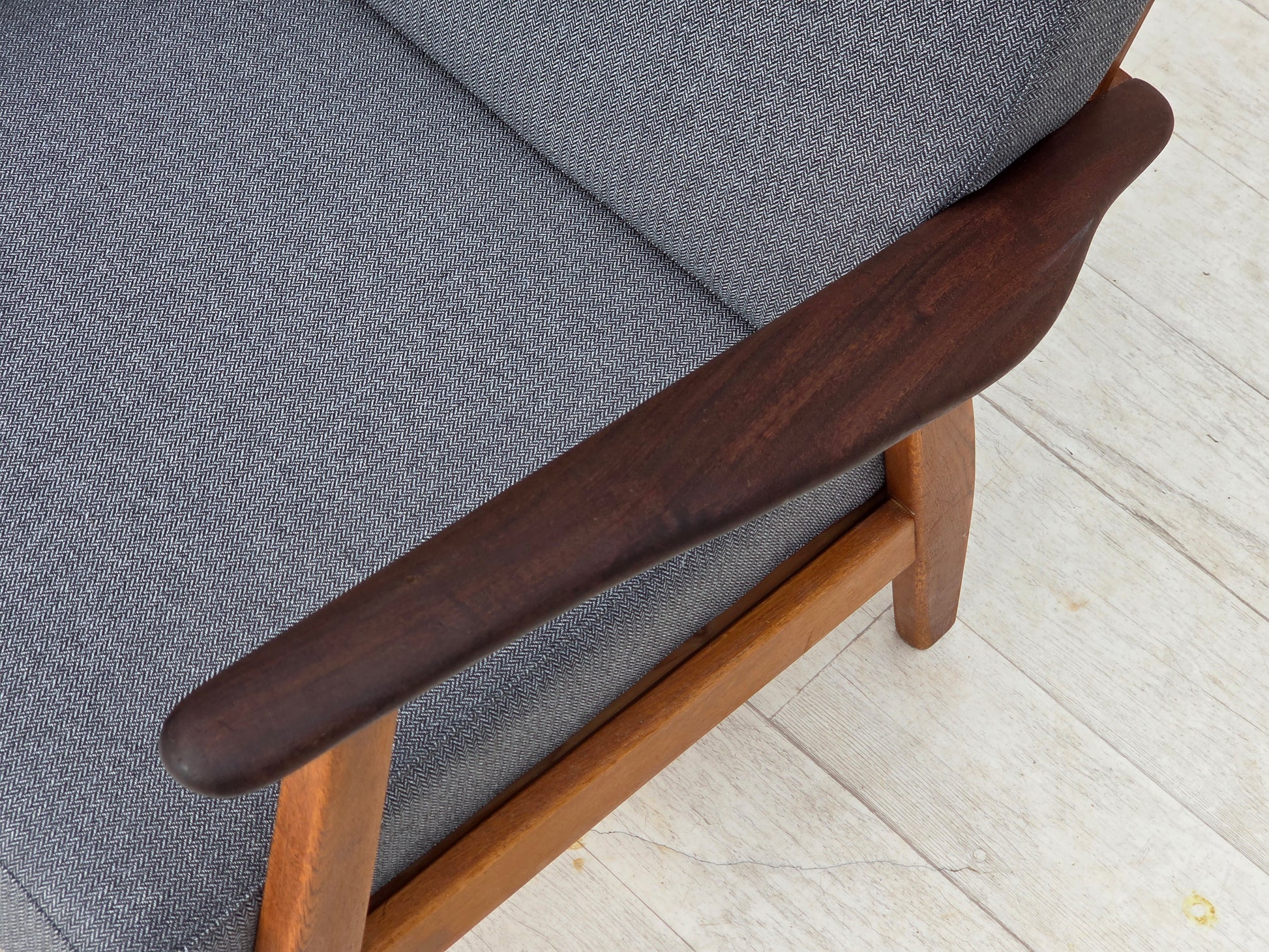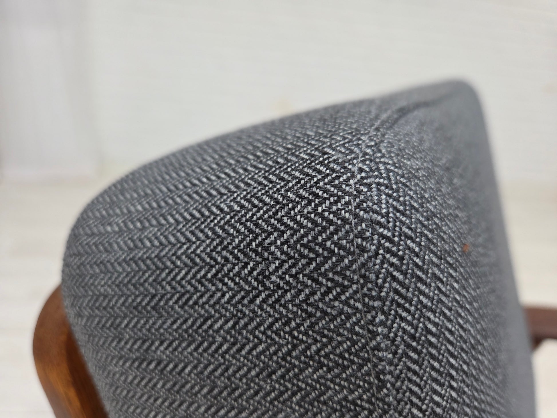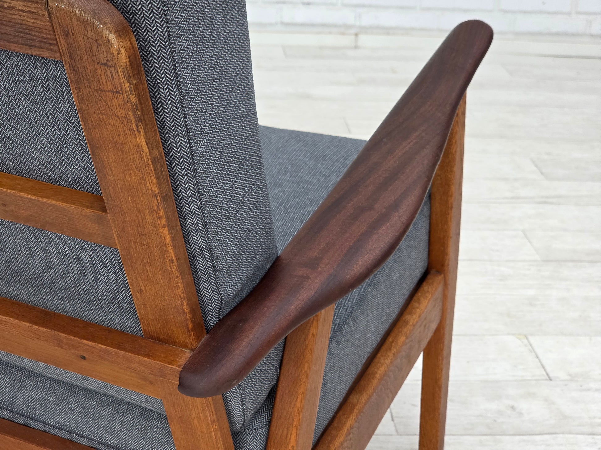 1970s, pair of Danish armchairs, reupholstered, furniture wool, teak and oak wood.