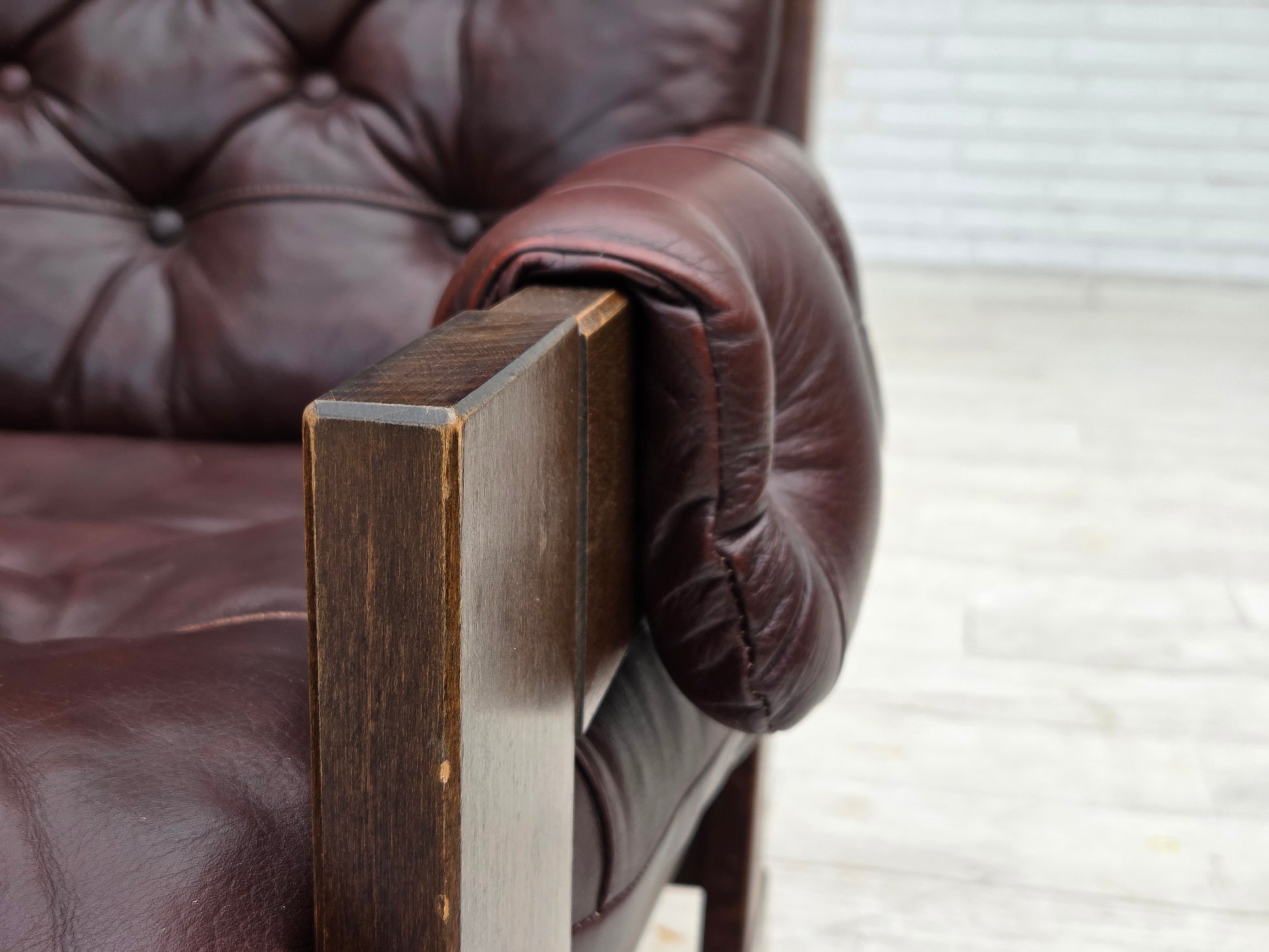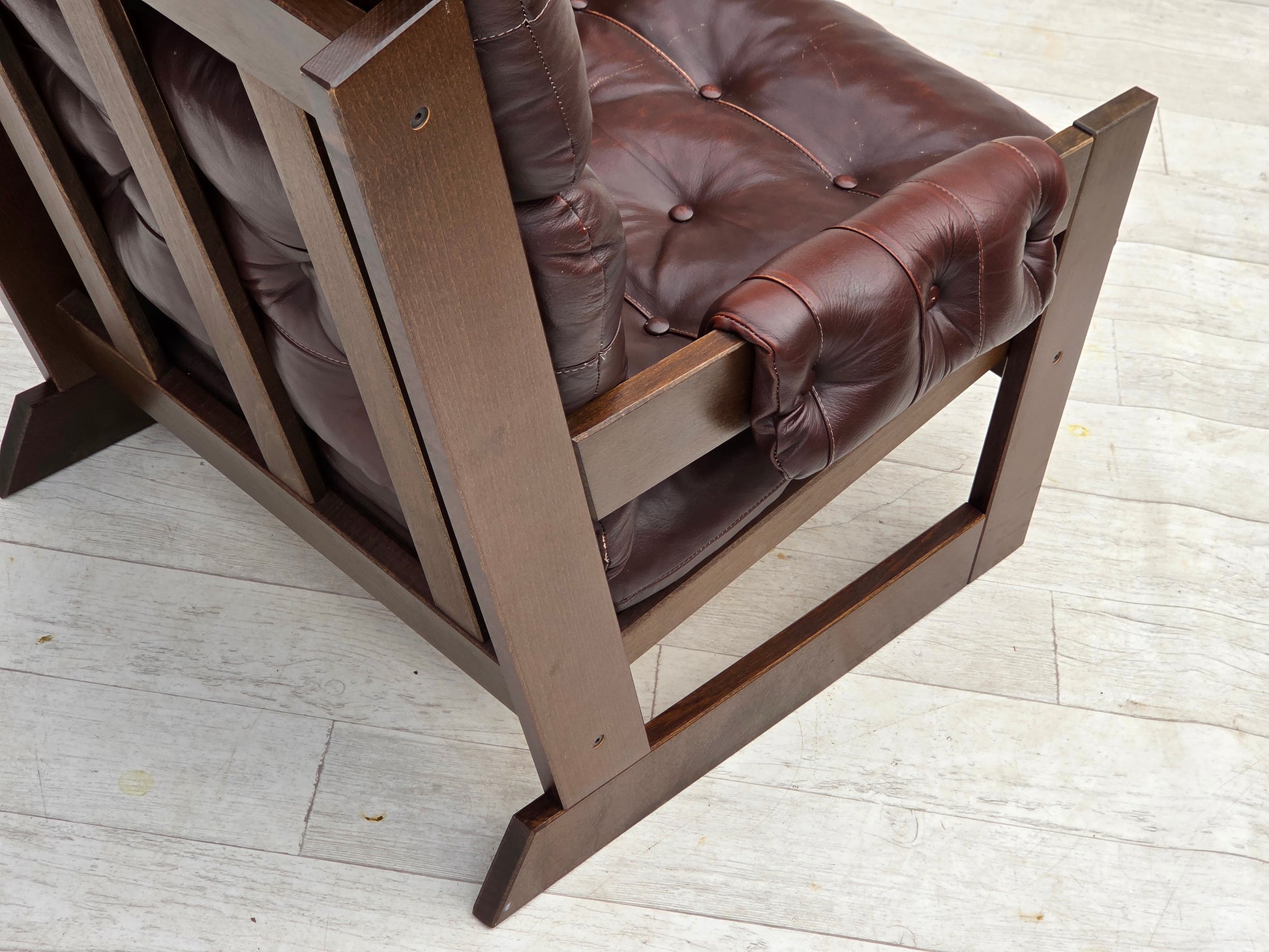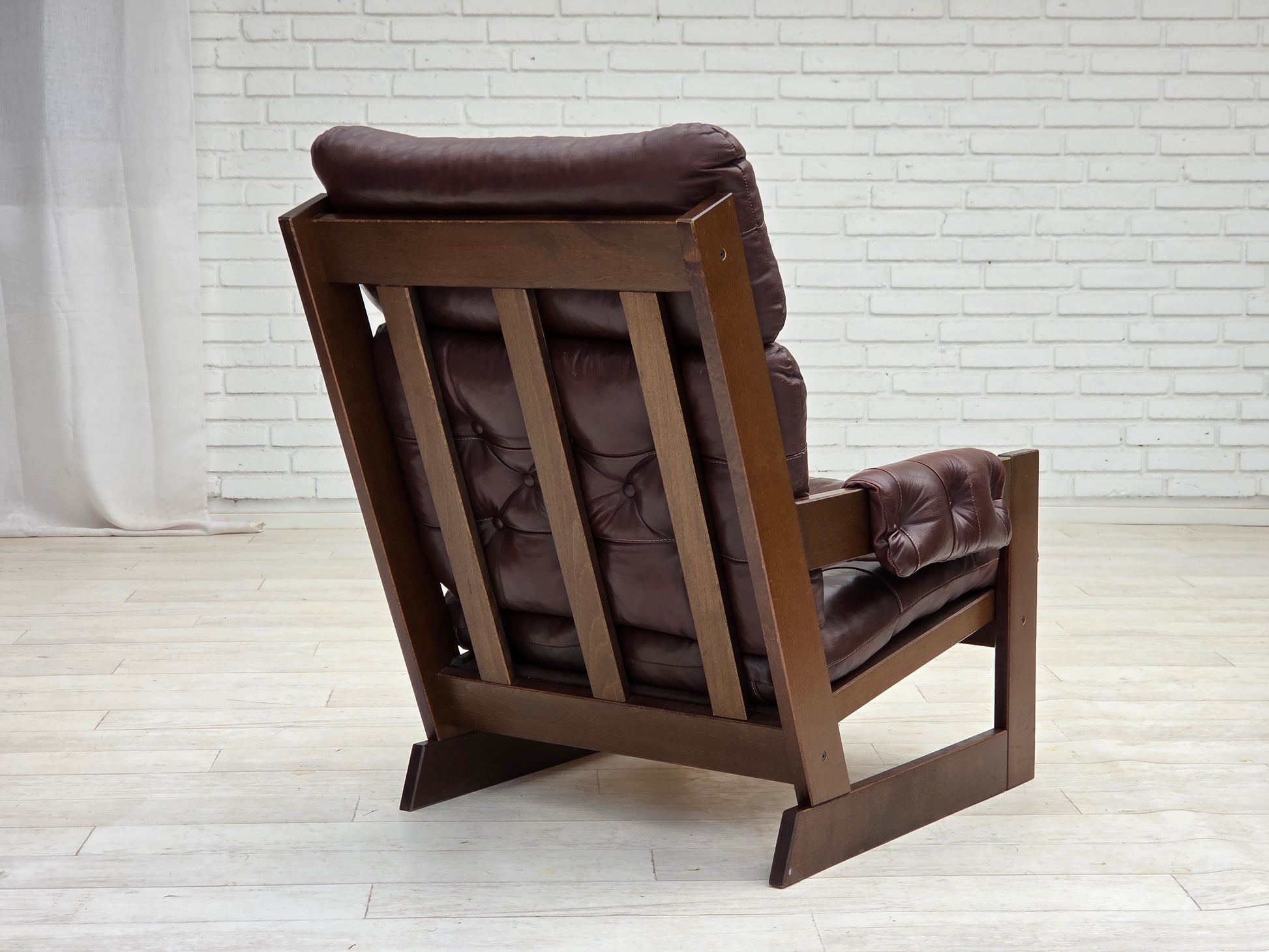 DESCRIPTION: 1970s, Scandinavian highback armchair. Brown furniture leather, dark beech wood. Original very good condition: no smells, no stains and stable construction. Manufactured by Danish or Swedish furniture maker in about 1975s. Original Scandinavian craftsmanship vintage design directly from Denmark. The chair was checked by craftsman.